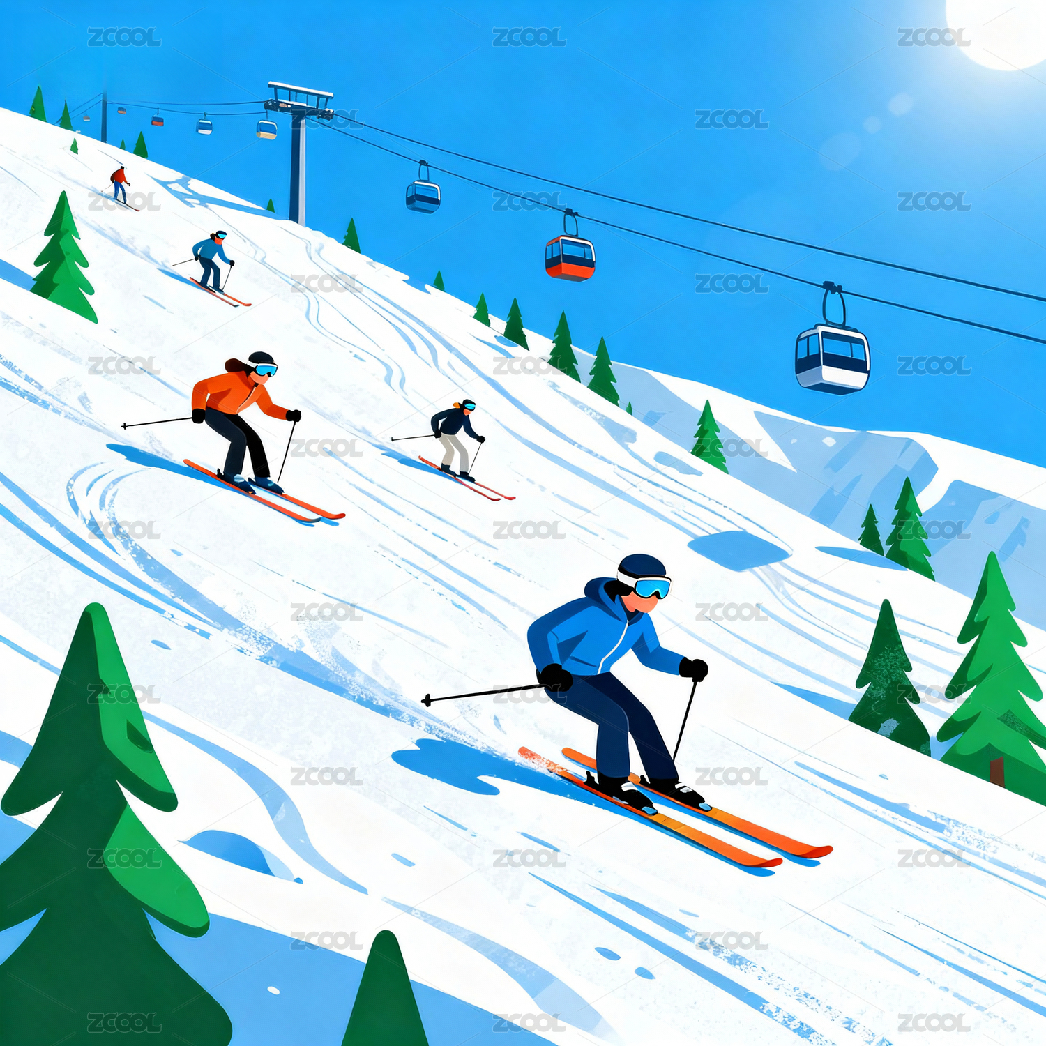 滑雪,雪山,冬季,平面,插画,人物,运动,滑雪者,松树,蓝天