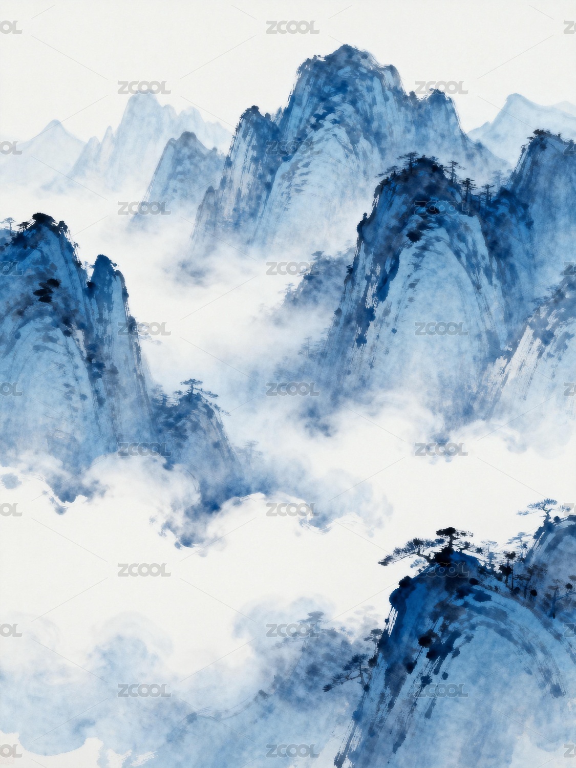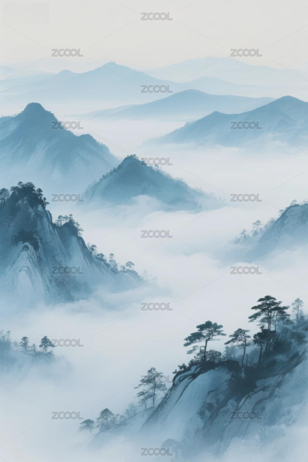 传统,白色,蓝色,艺术,流动,天空,山峰,云雾,树木,淡雅