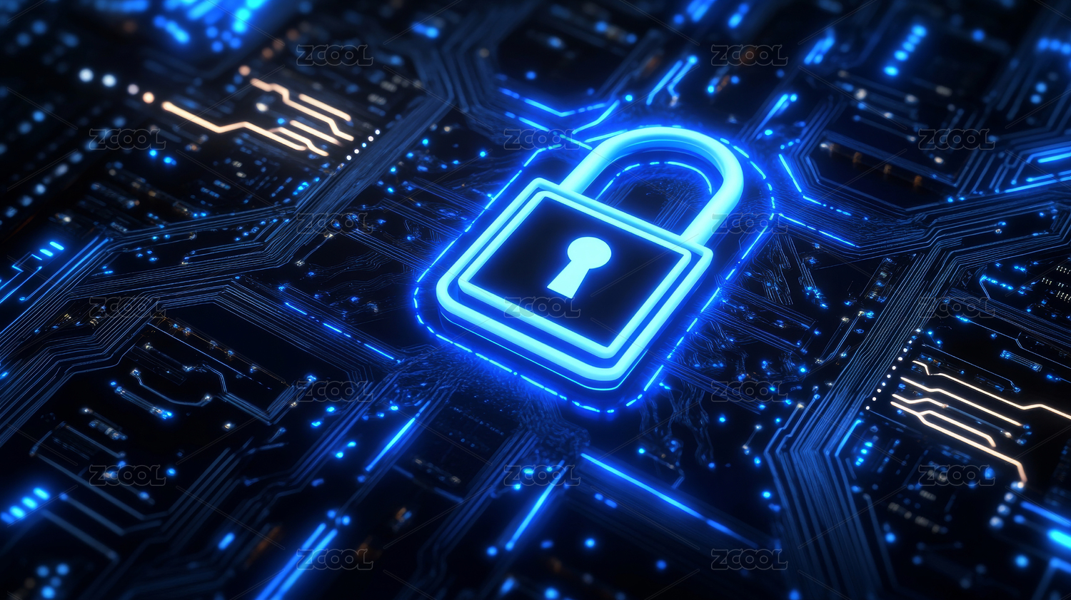 橙色锁具与蓝色电路板的科技安全象征