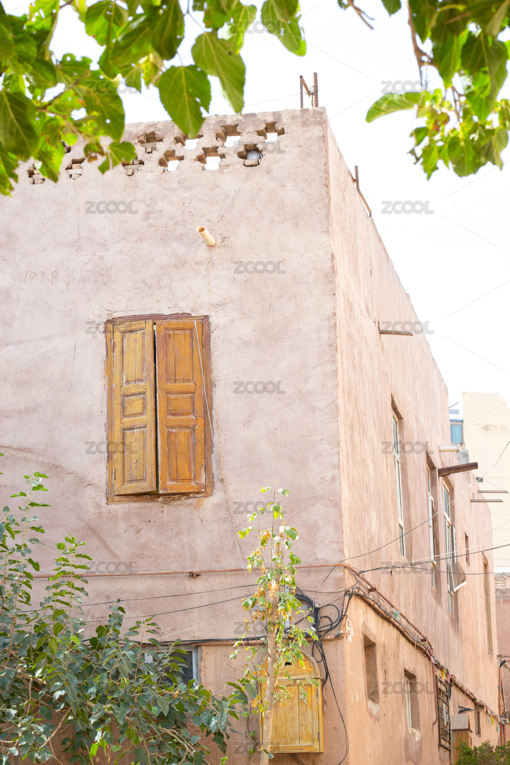 中国新疆喀什传统房屋建筑的土墙和阁楼木窗