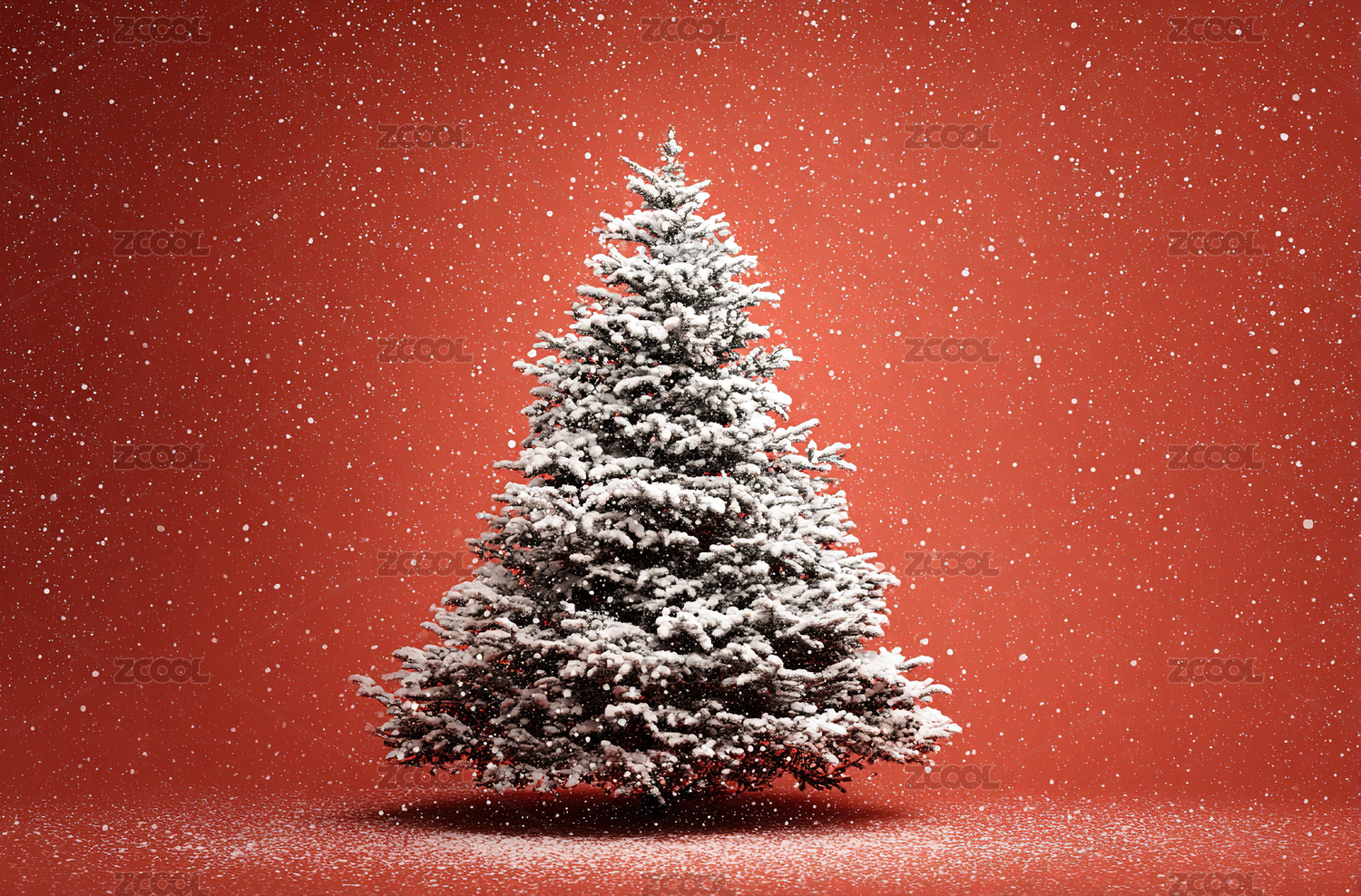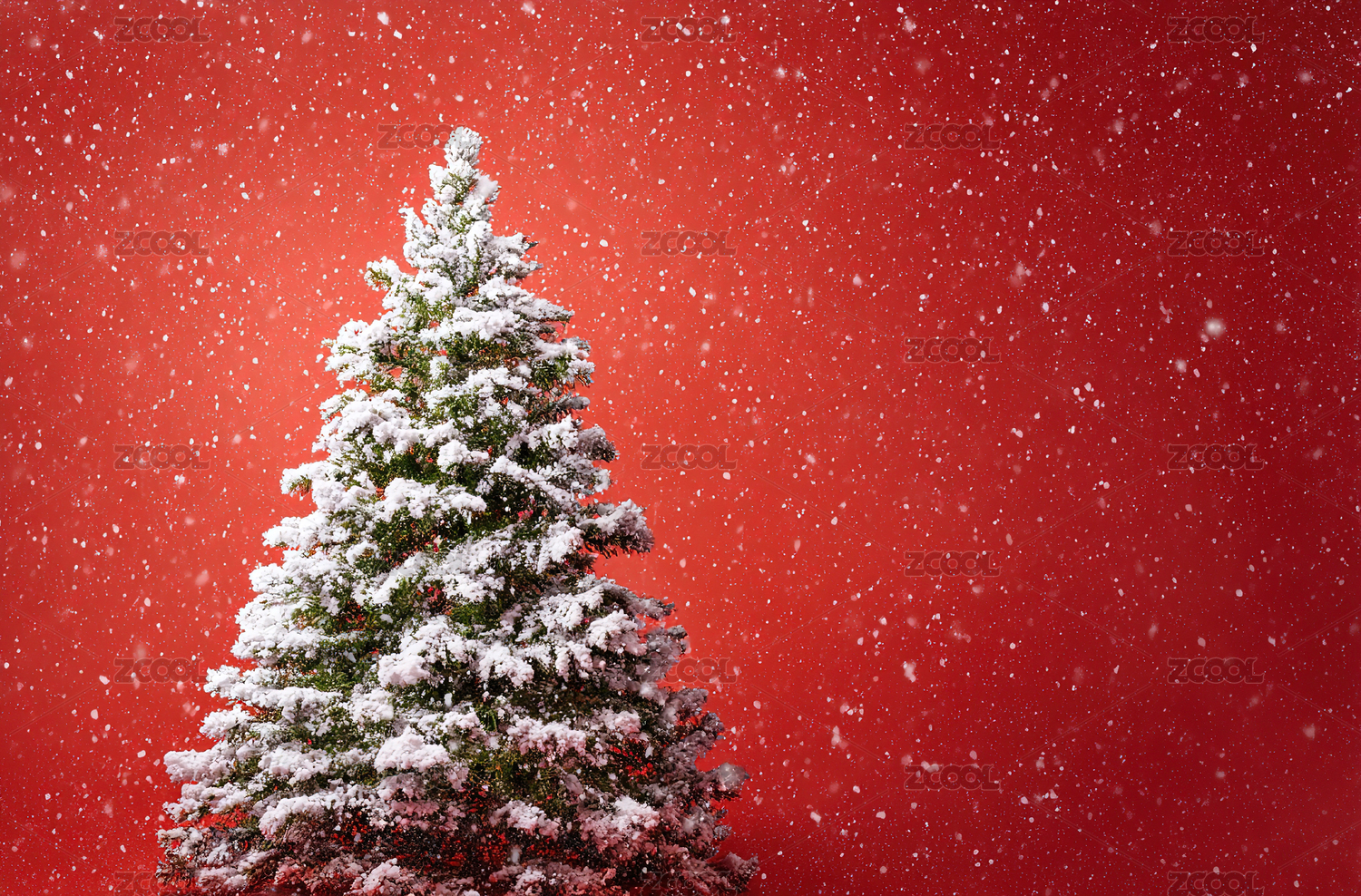 雪覆圣诞树红色背景