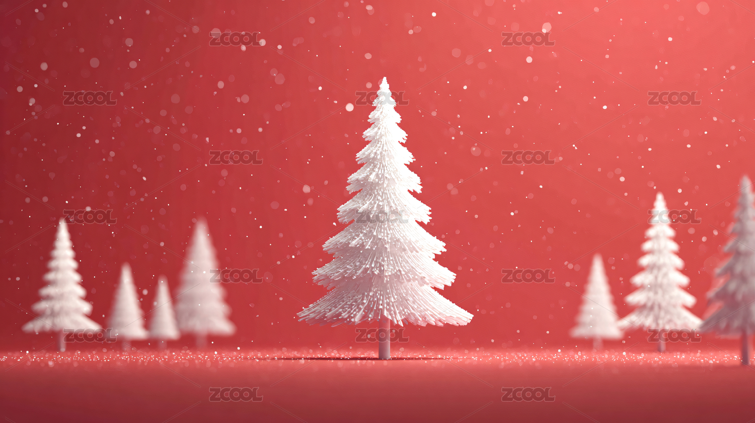 雪覆松树红色背景