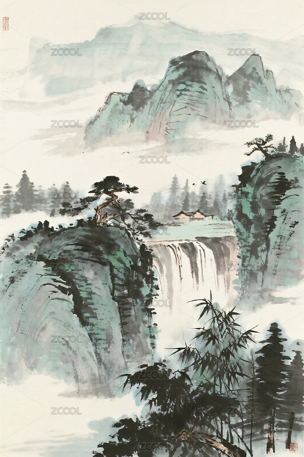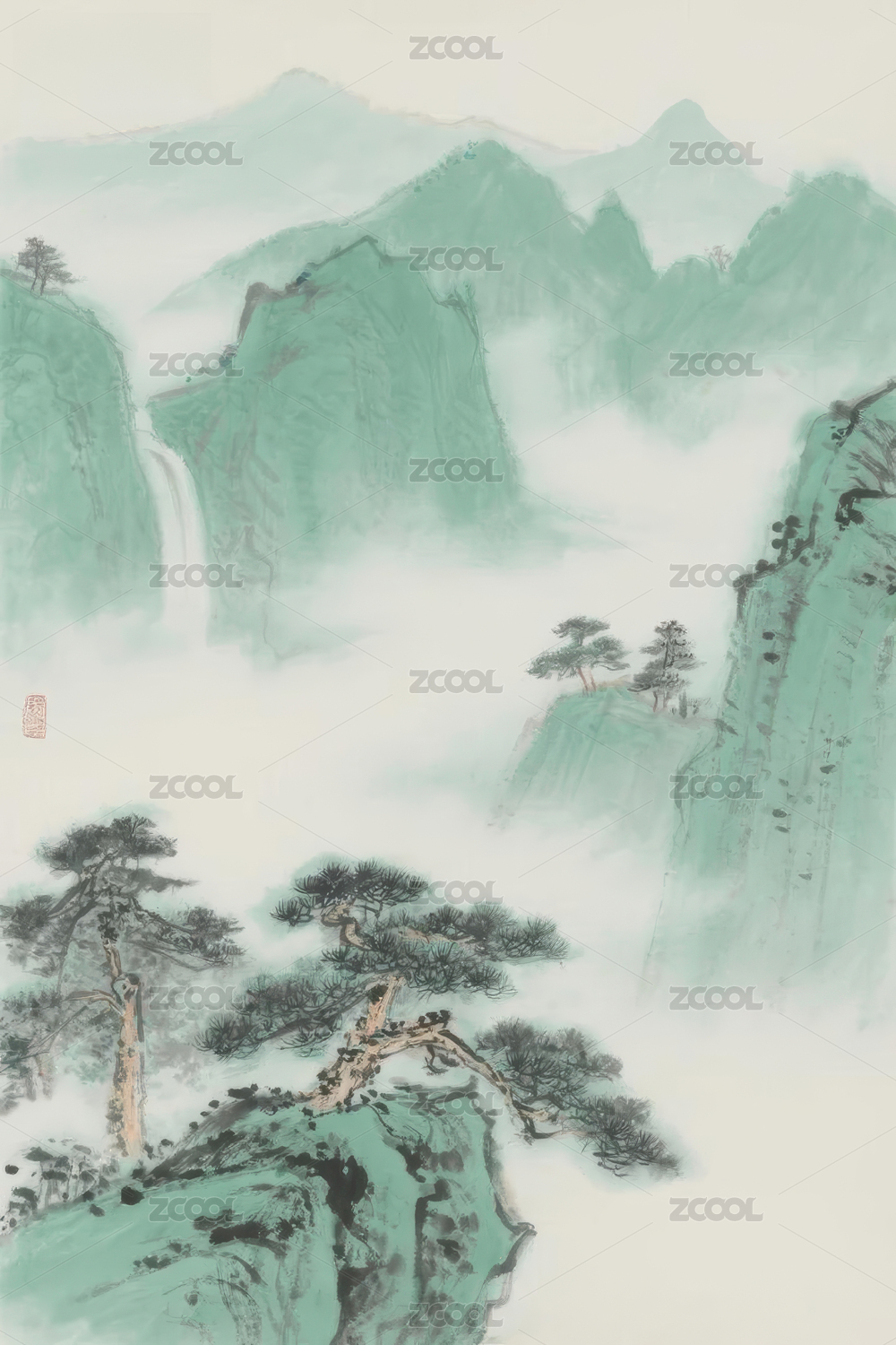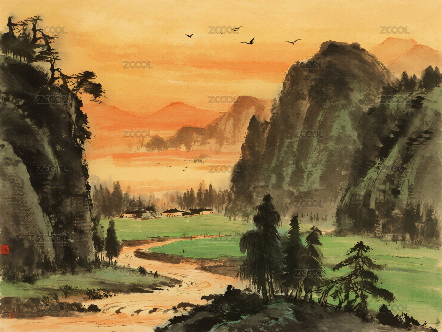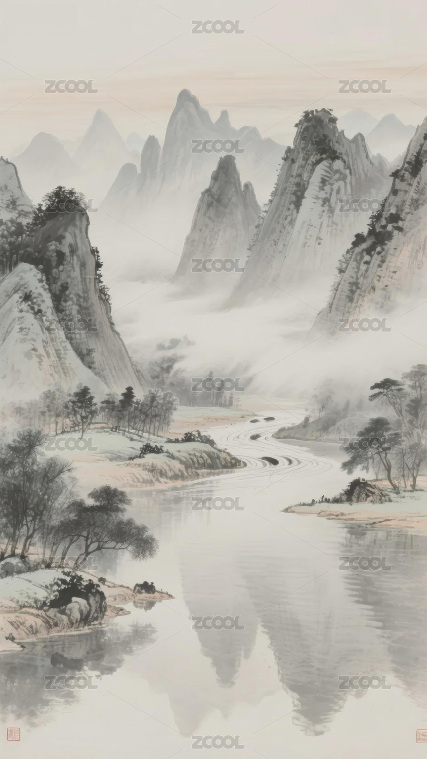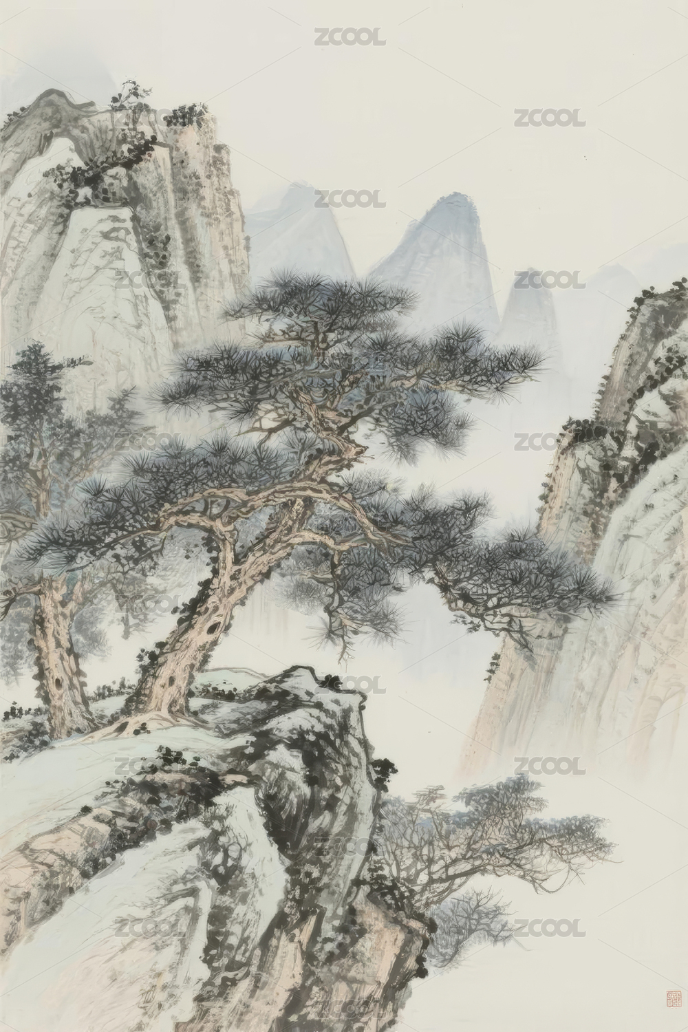 传统,自然,静谧,树木,远山,雪地,层次,构图,艺术,绘画