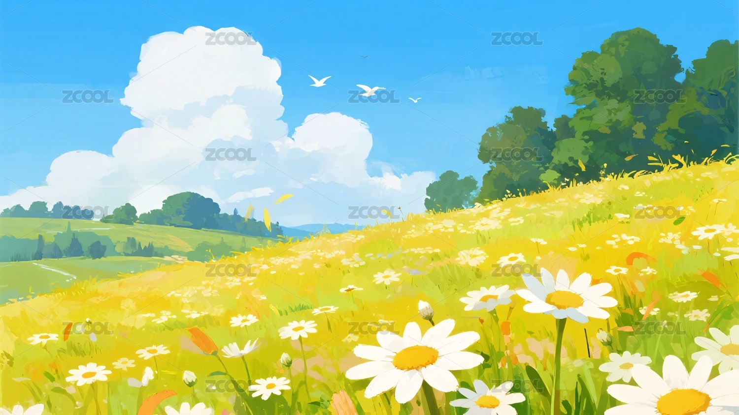 草地,花朵,田园,风景,山水,房屋,树木,天空,云朵,插画