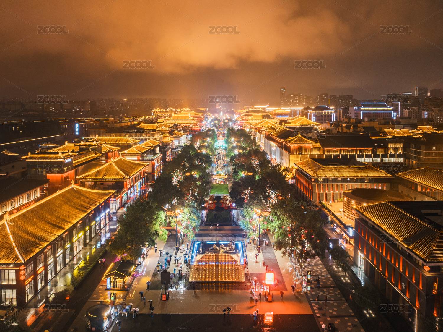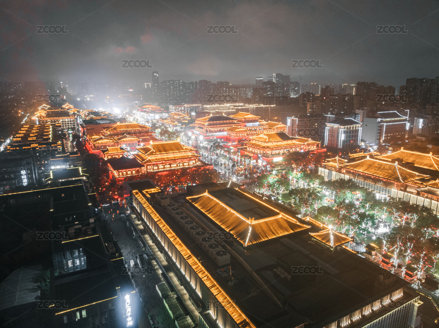 中国陕西西安大雁塔大唐不夜城夜景航拍风光