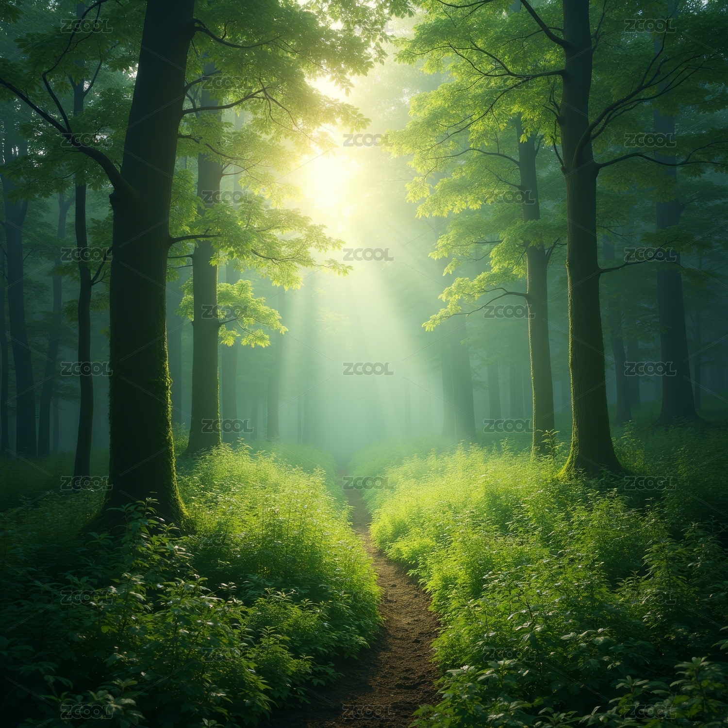 阳光穿透森林绿意盎然