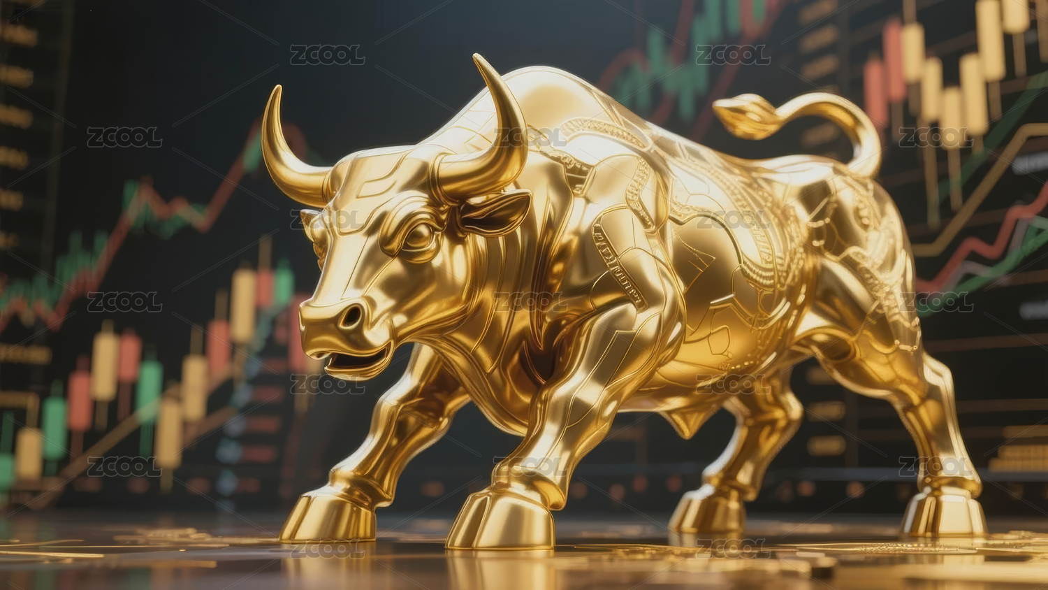 金色公牛与股市图表背景象征牛市