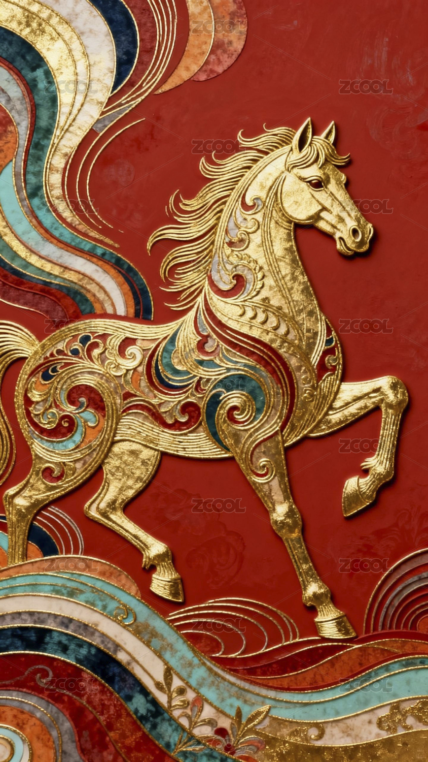 中国传统生肖马敦煌纹样红金配色立体浮雕