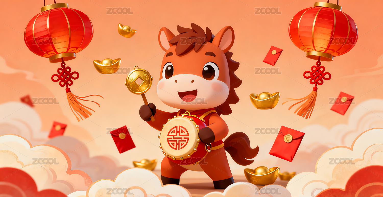 节日喜庆场景中的舞狮与小马马年喜庆的场景