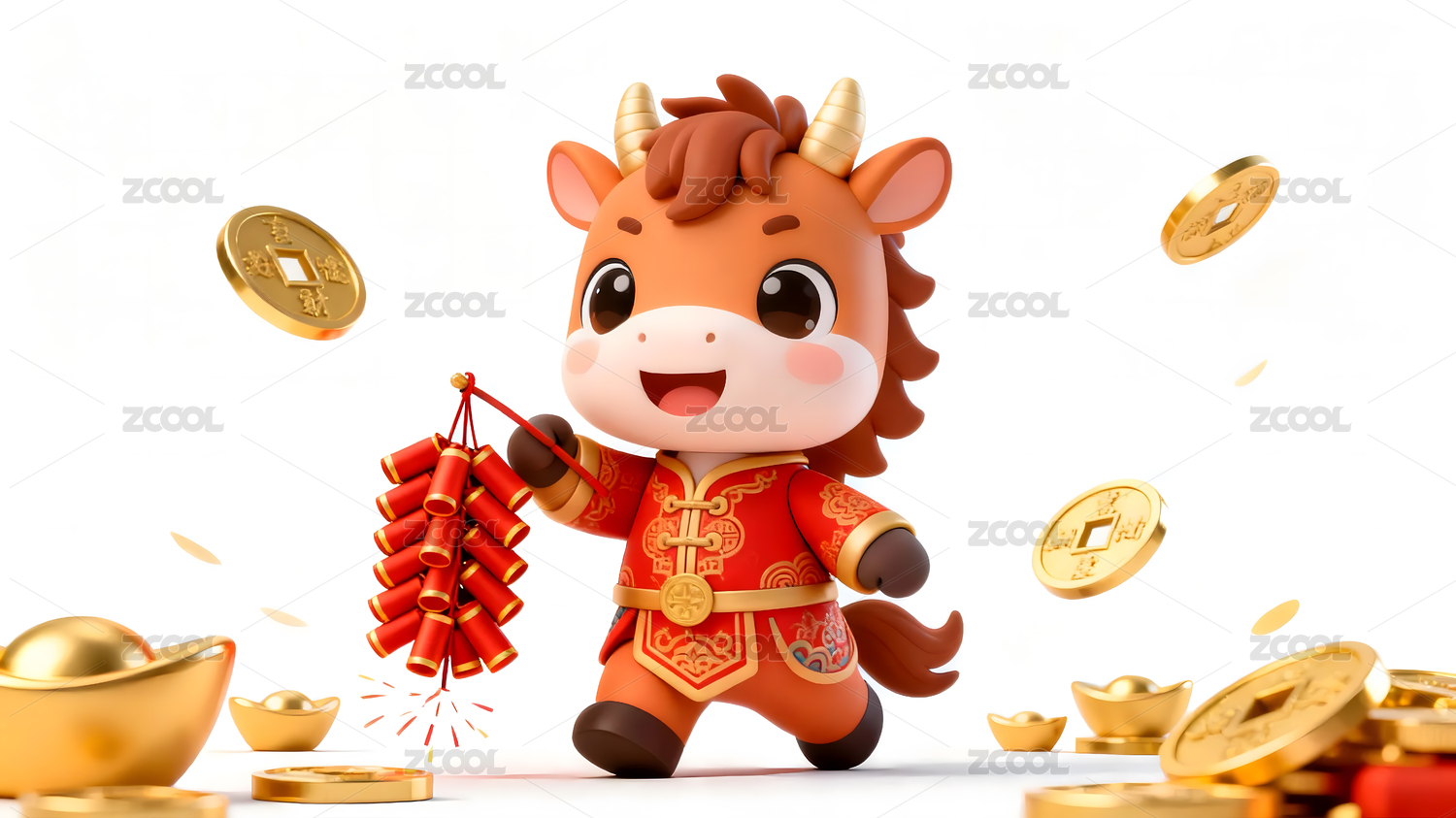 3DQ版春节卡通小马持鞭炮春节素材白背景