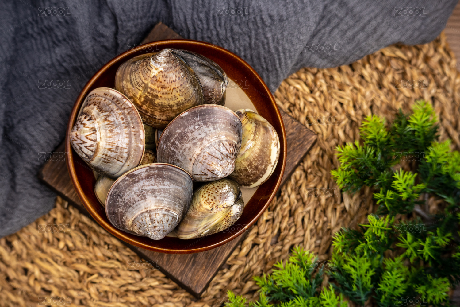 桌面餐具放着新鲜文蛤蛤蜊生鲜食材水产品