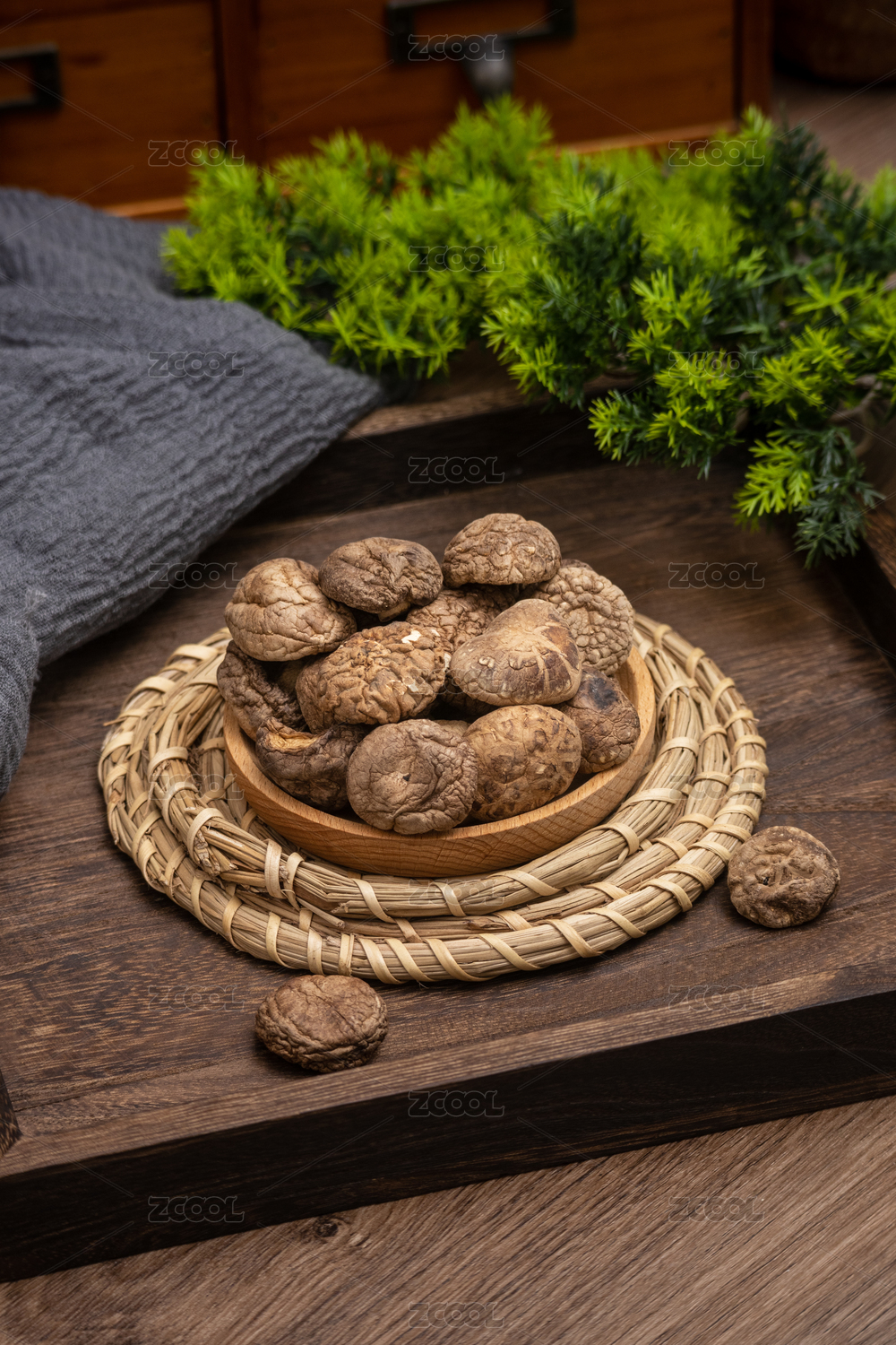 桌面盘子摆放晒干脱水的干香菇菌菇干货
