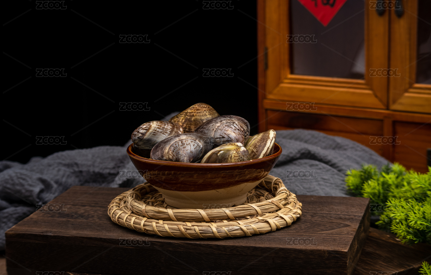 桌面餐具放着新鲜文蛤蛤蜊生鲜食材水产品