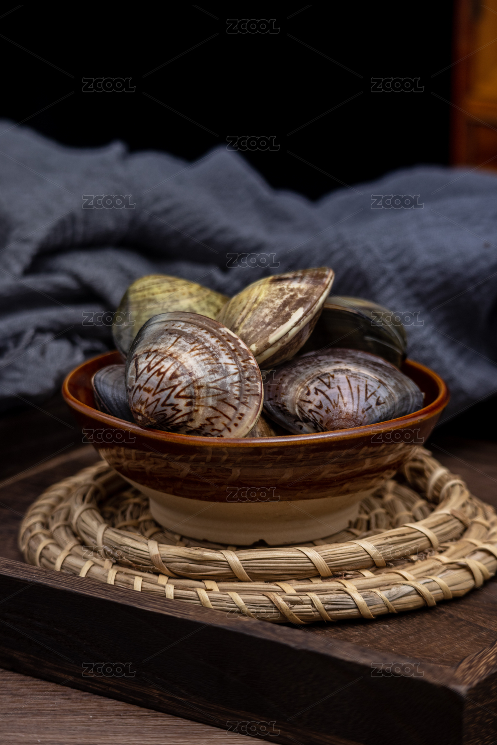 桌面餐具放着新鲜文蛤蛤蜊生鲜食材水产品