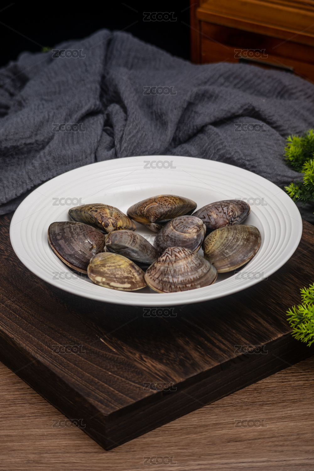 桌面餐具放着新鲜文蛤蛤蜊生鲜食材水产品