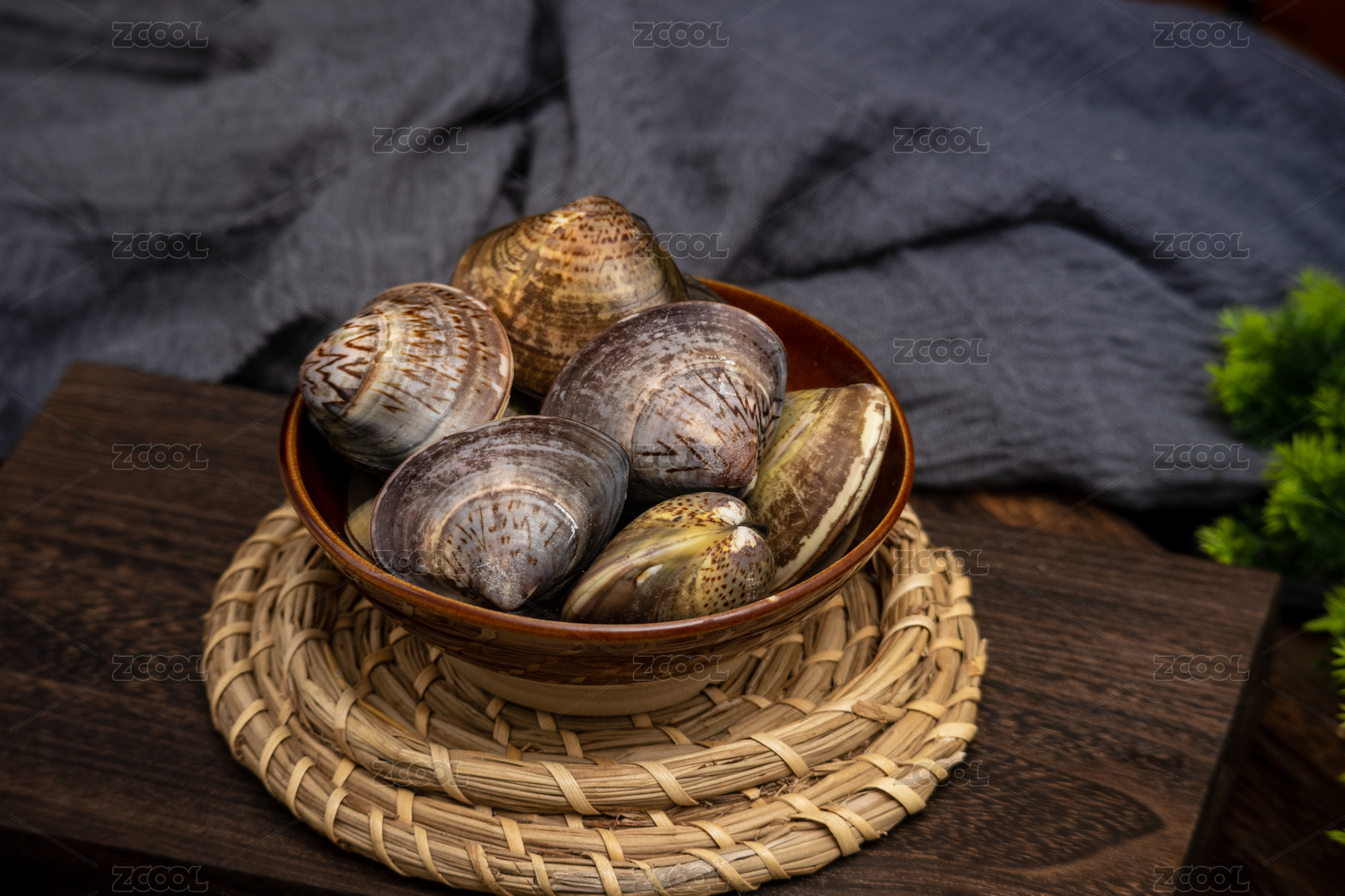 木桌背景一盘爆炒花蛤