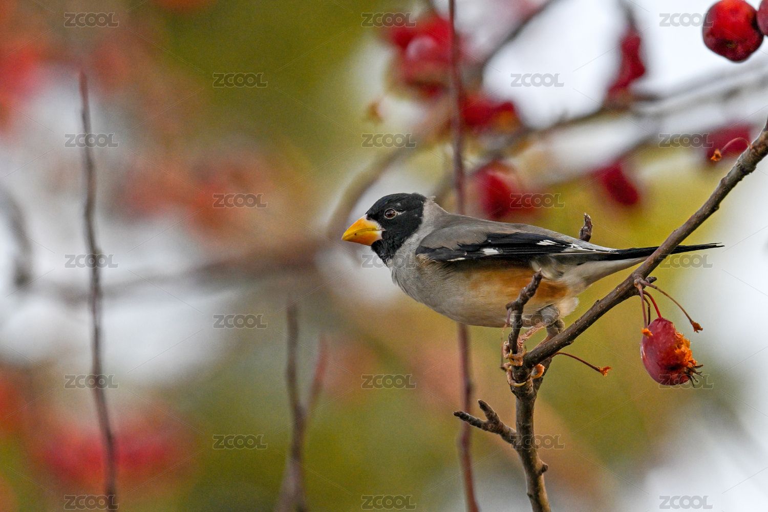 栖息在果树上摘果子的蜡嘴雀