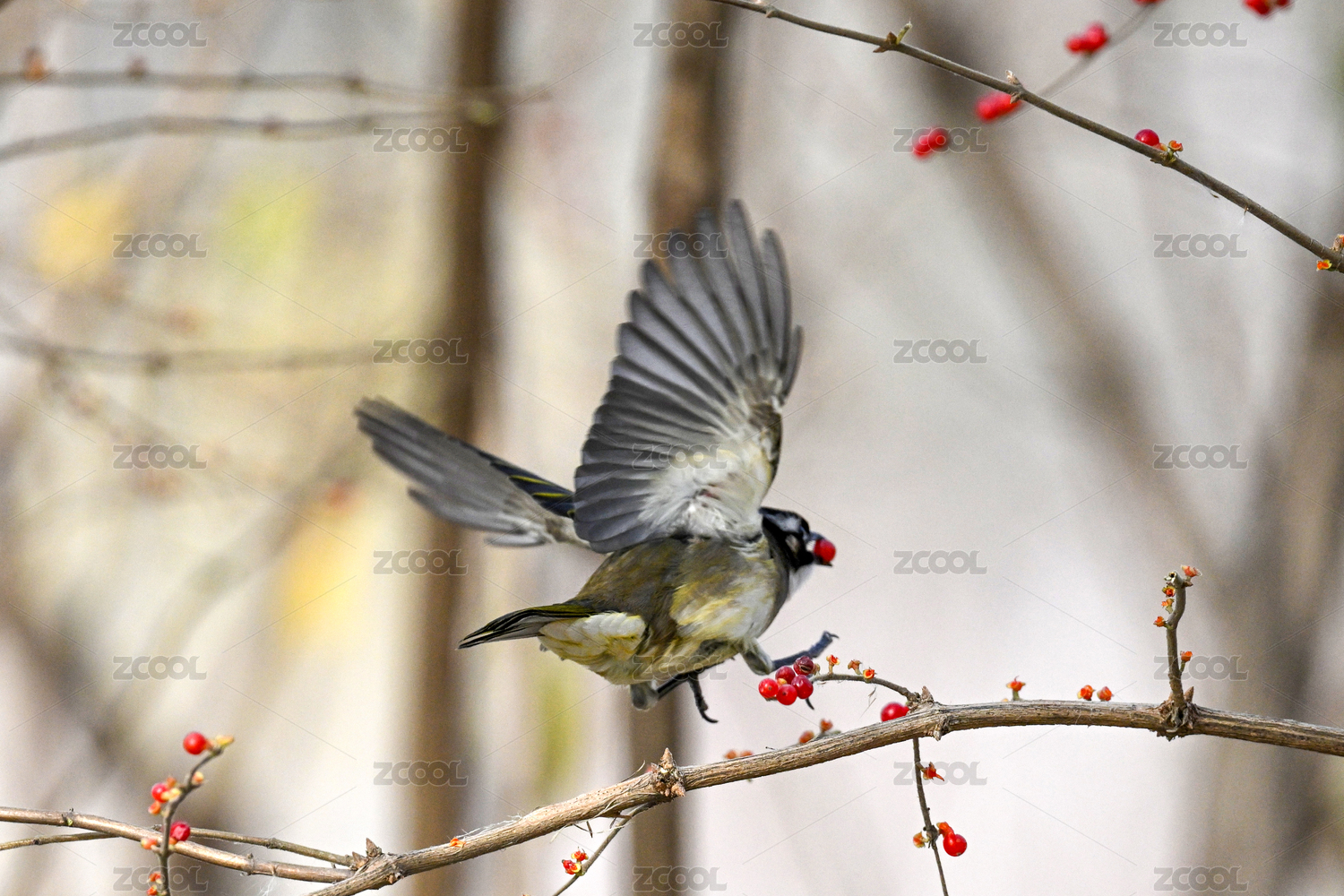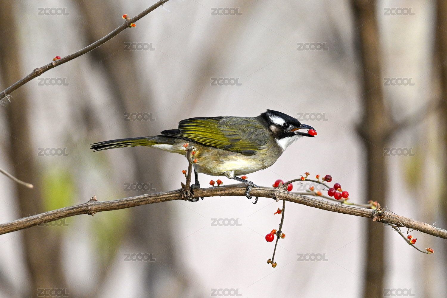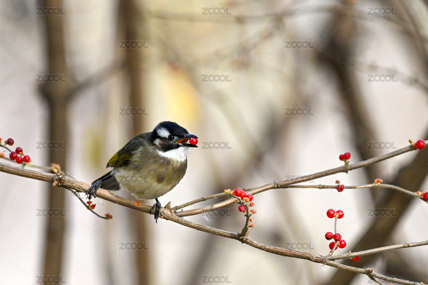 站在树枝上摘果子的白头鹎