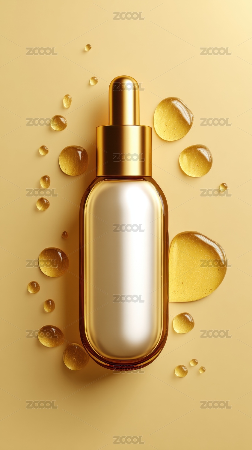 金色瓶身的精华液与油滴
