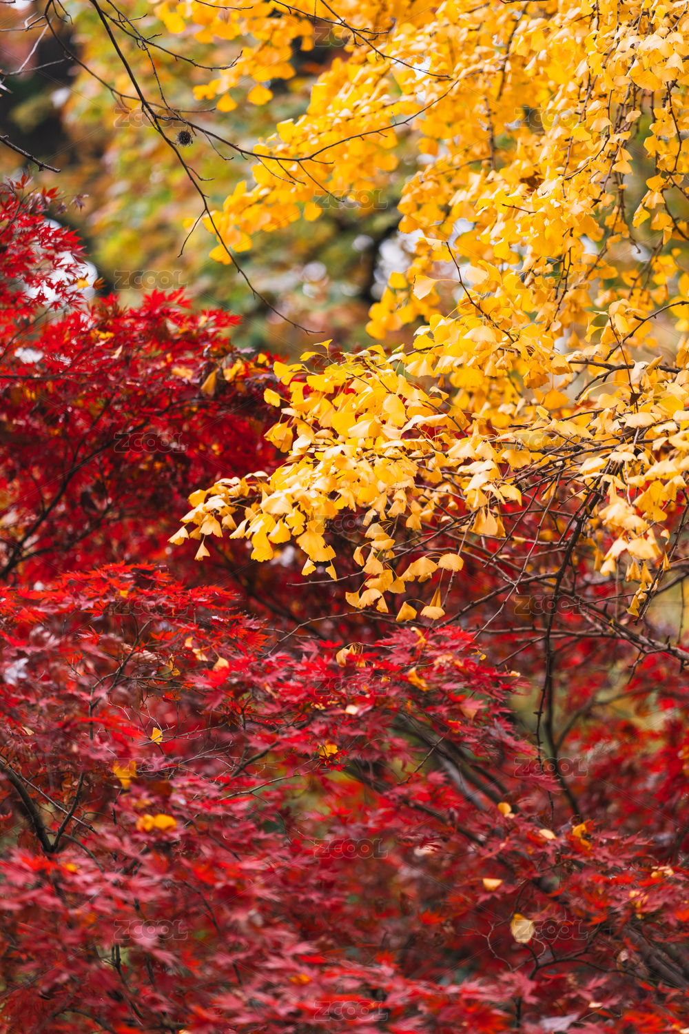 秋天红色枫叶和绿树相映