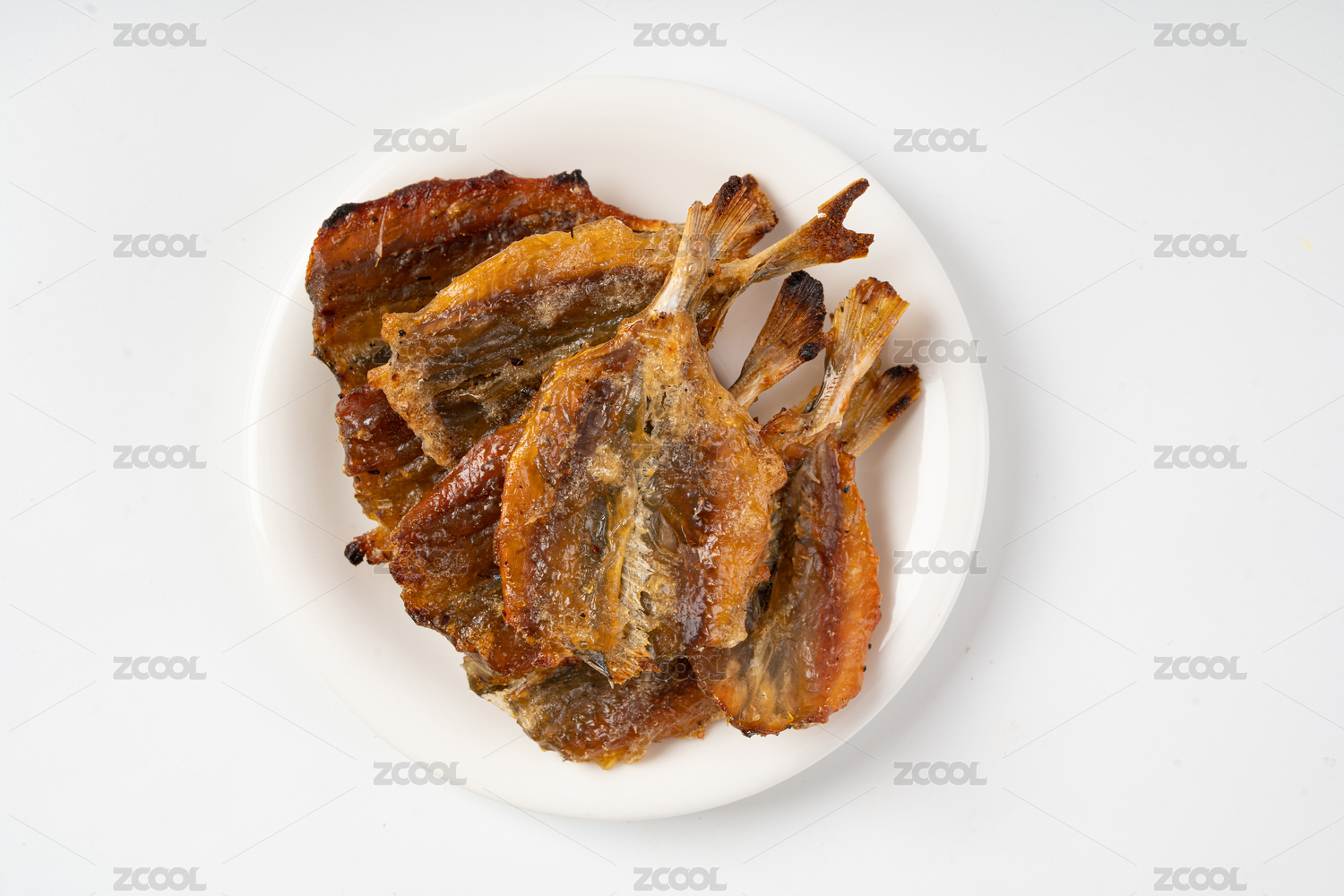 一盘黄鱼酥和茶水摆放在白色背景上特写