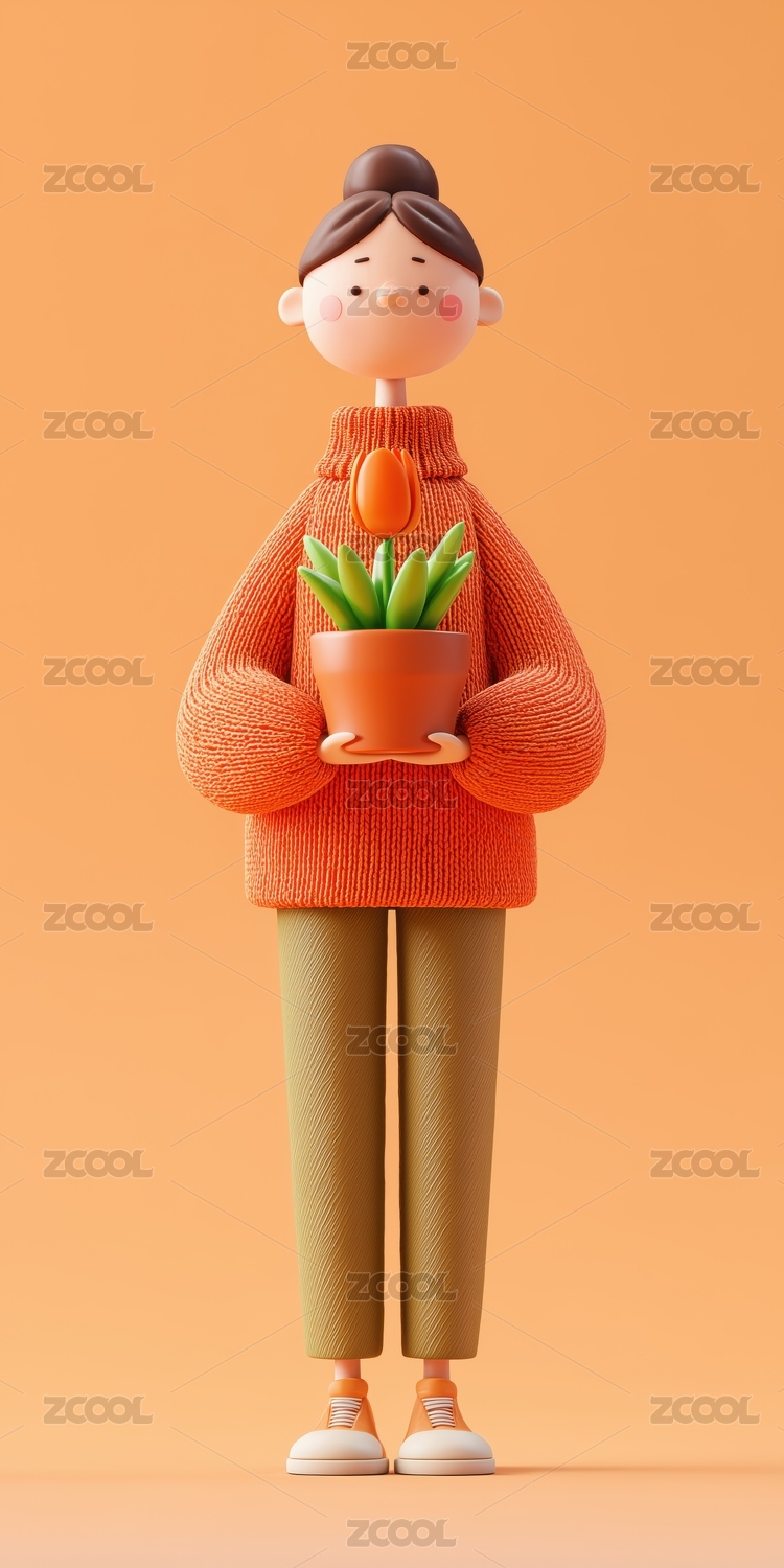 抱盆花穿彩色毛衣的粘土女孩子3D卡通人物
