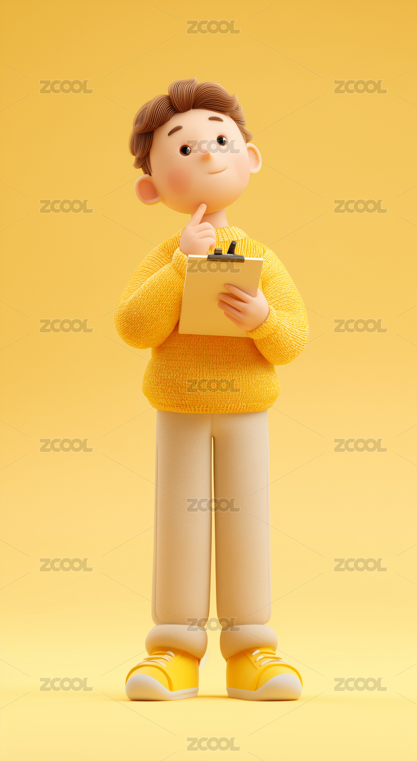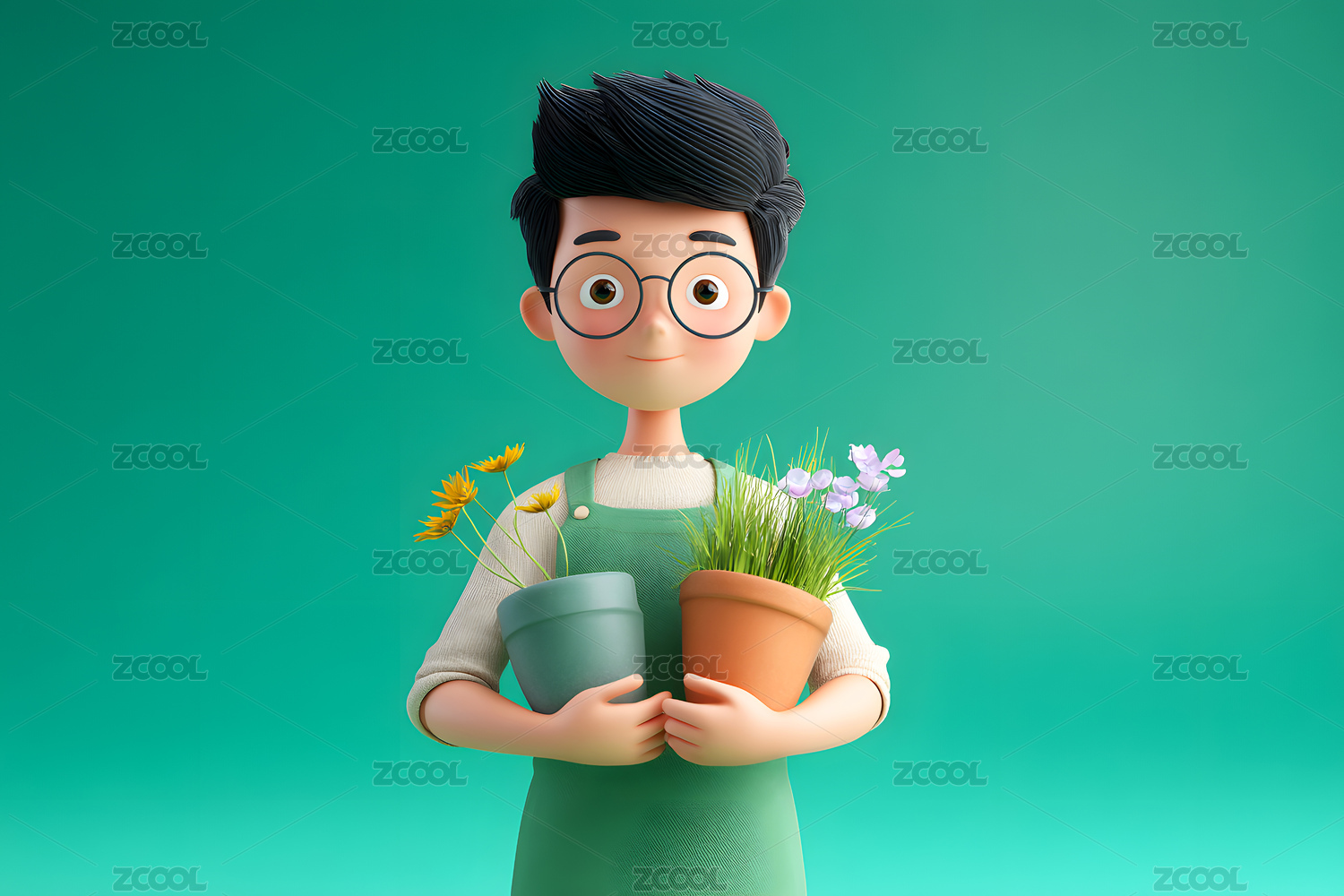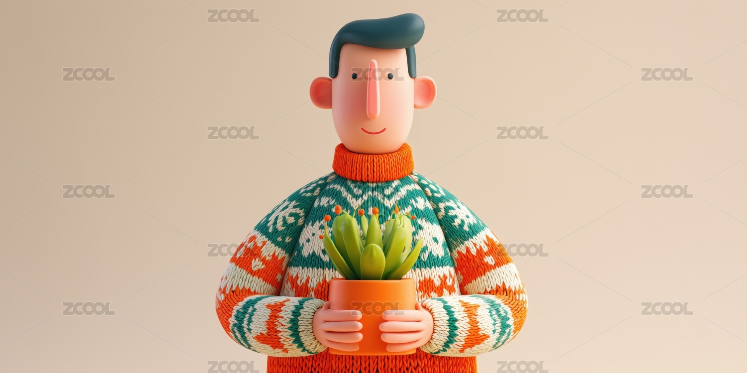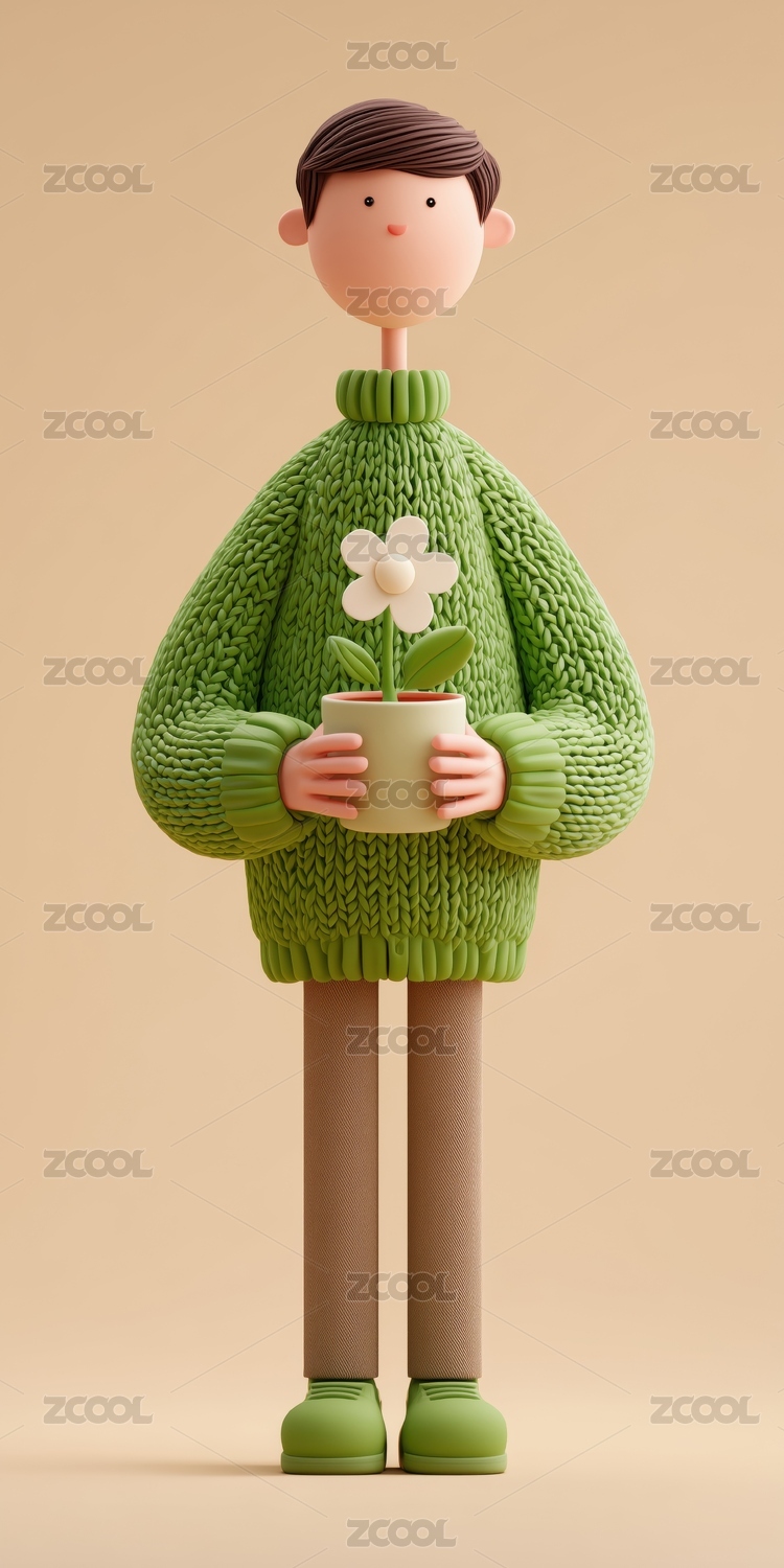 抱着盆花穿彩色毛衣可爱粘土男孩子3D卡通