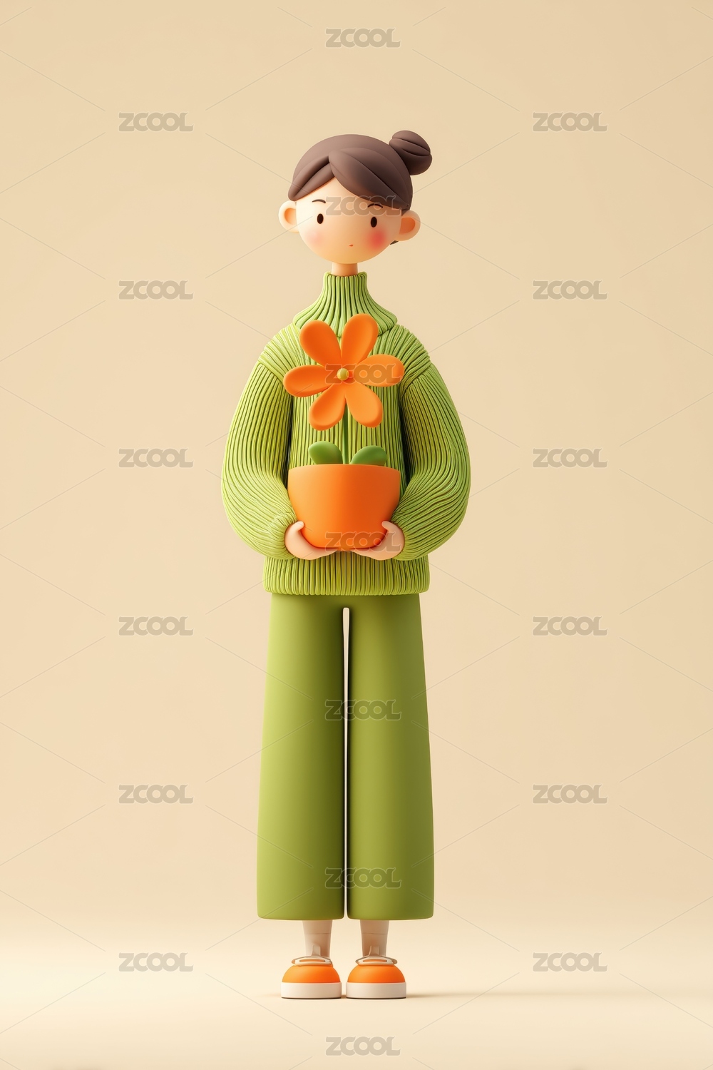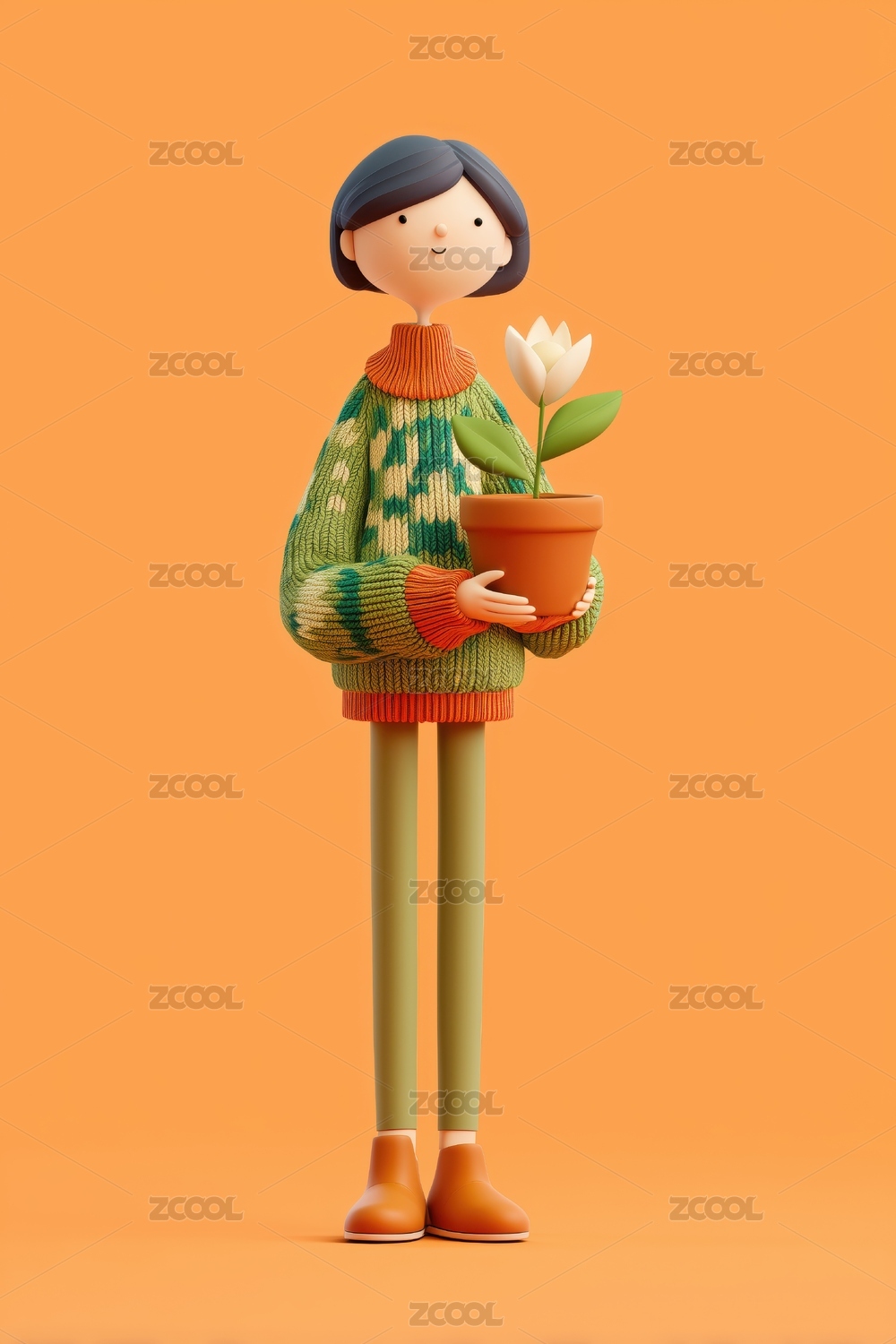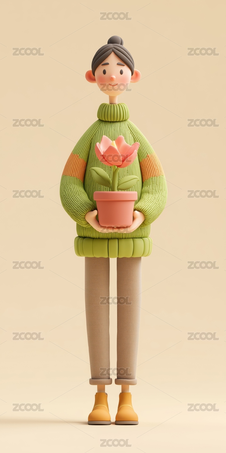 抱盆花穿彩色毛衣的粘土女孩子3D卡通人物