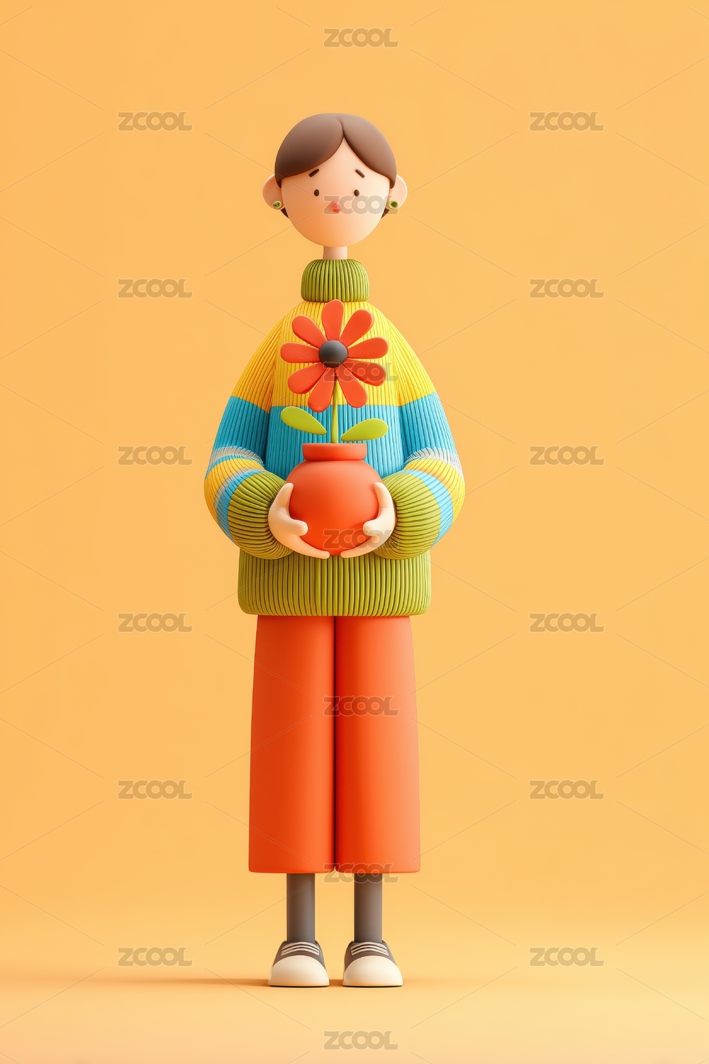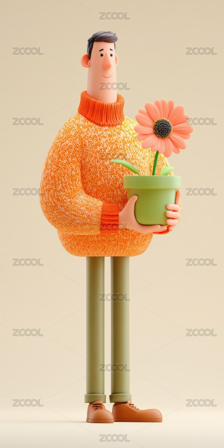 抱着盆花穿彩色毛衣可爱粘土男孩子3D卡通