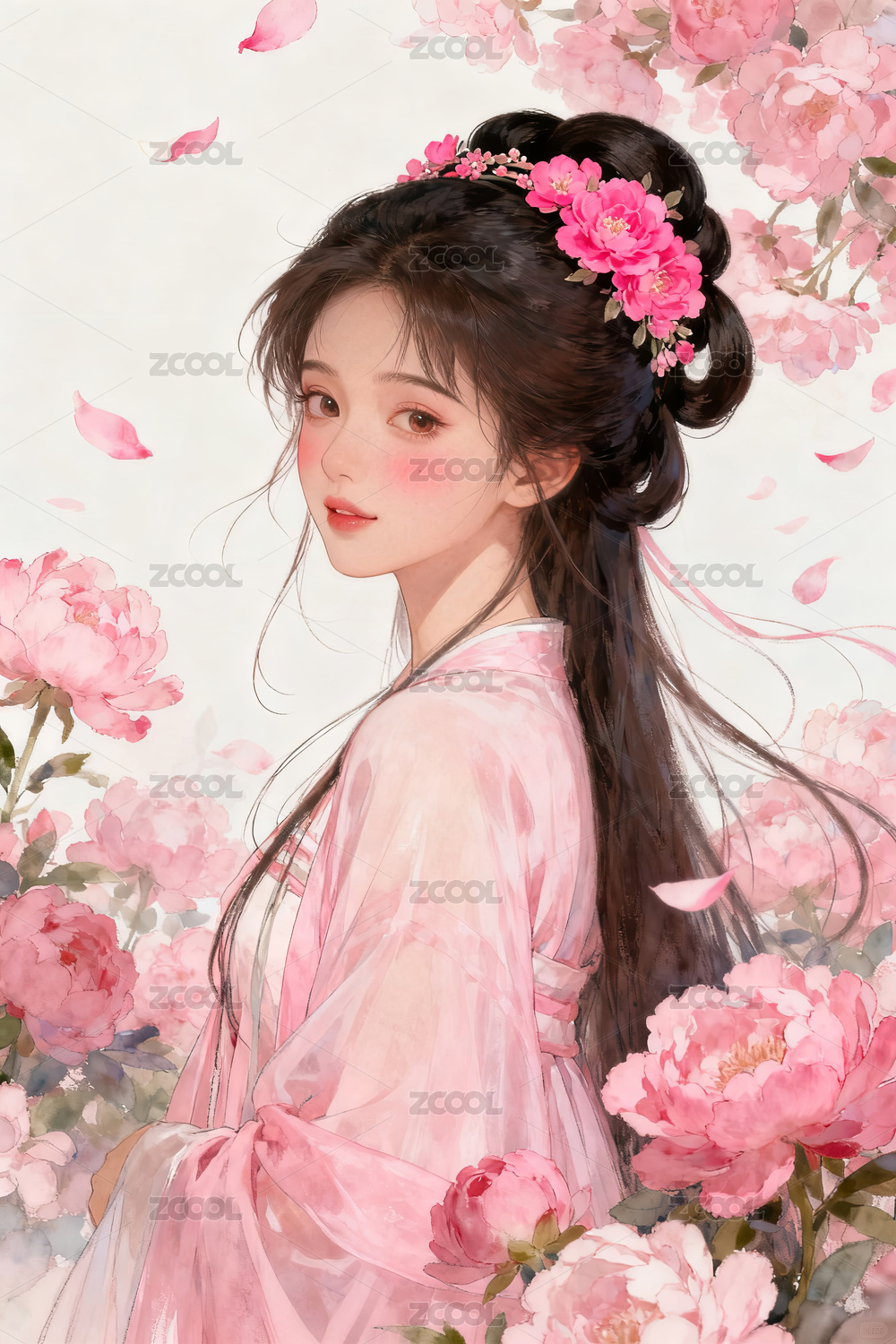 粉色花丛中的汉服女子插画