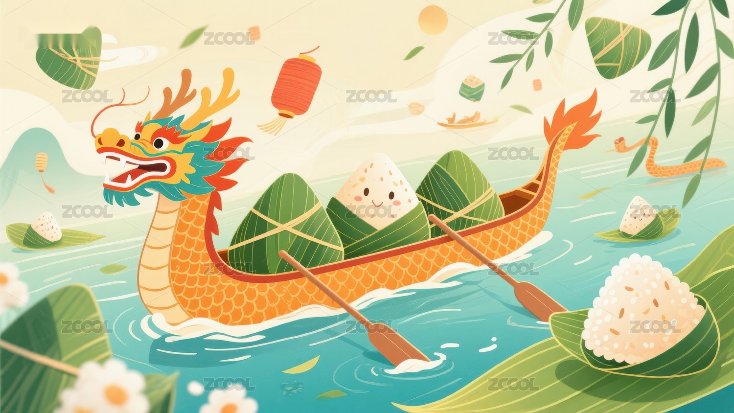 端午节,粽子,荷包,祥云,波浪,龙舟,扁平,渐变色