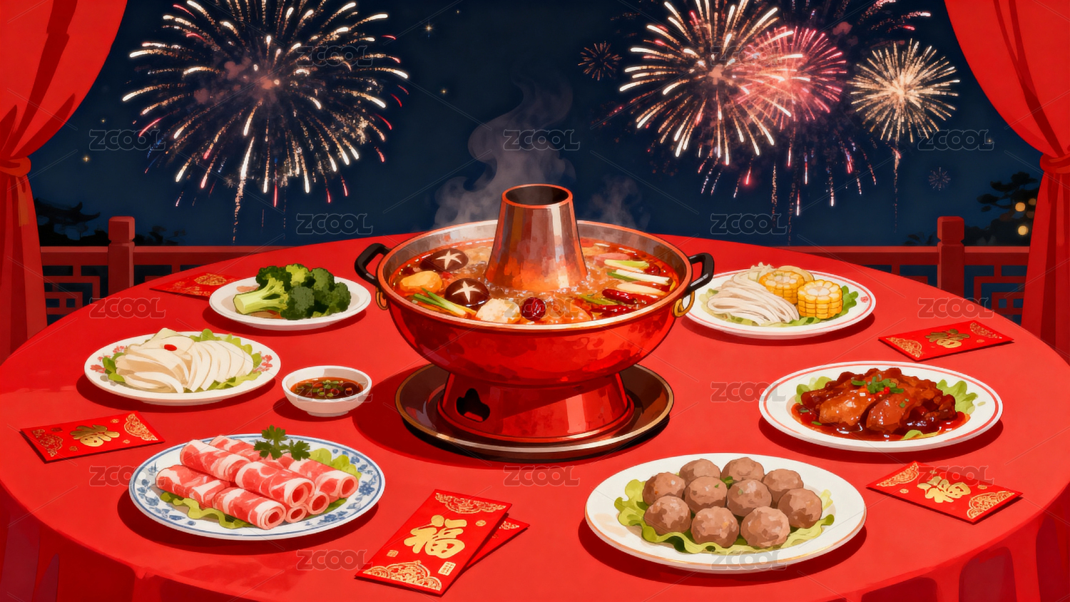 中式火锅夜景窗外烟花