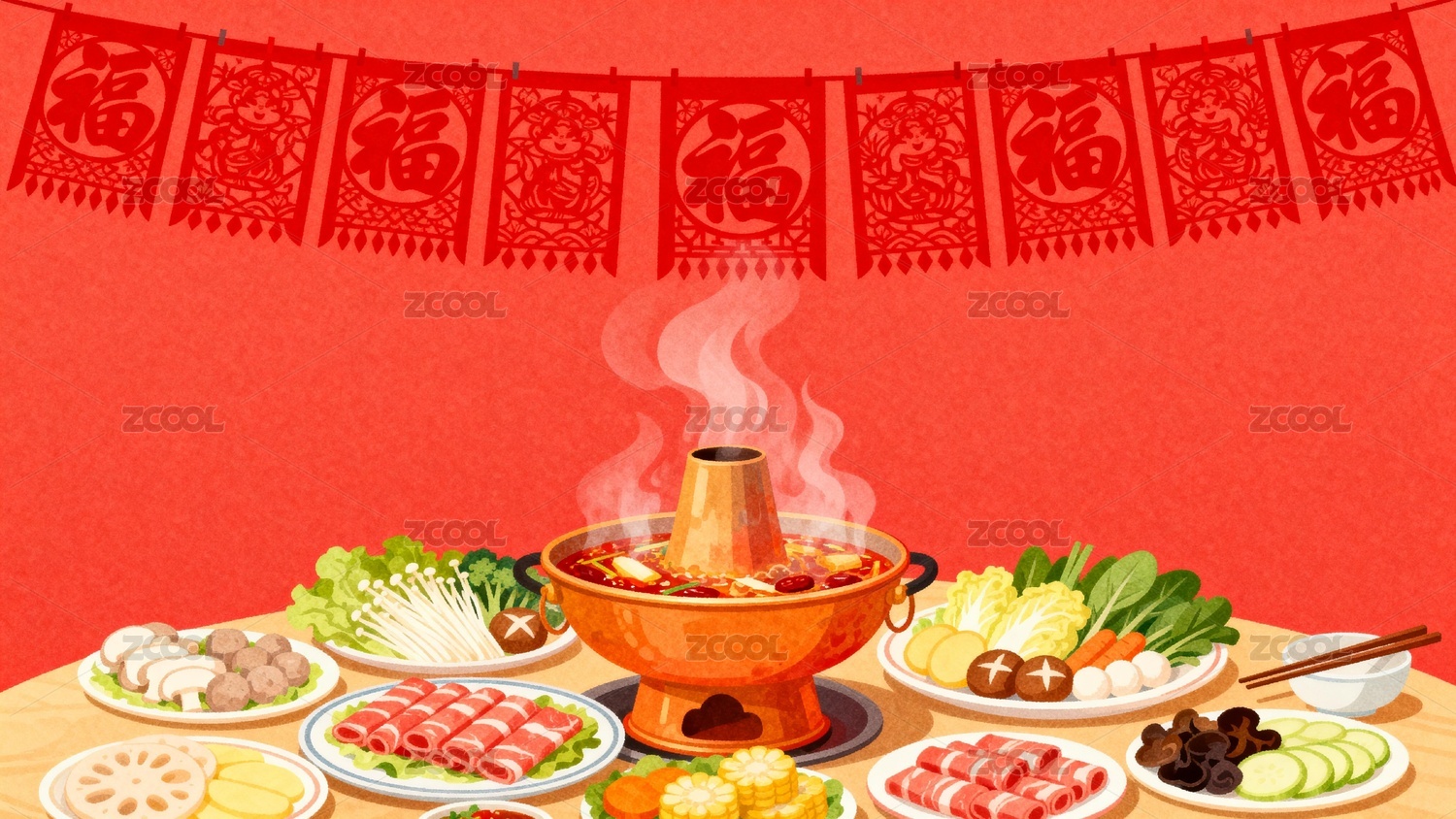 红色背景下的火锅美食插画