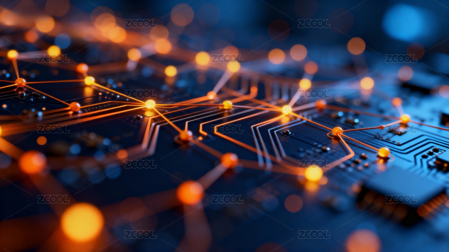 蓝色,科技,视觉,电路,发光,芯片,细节,橙色,背景,连接