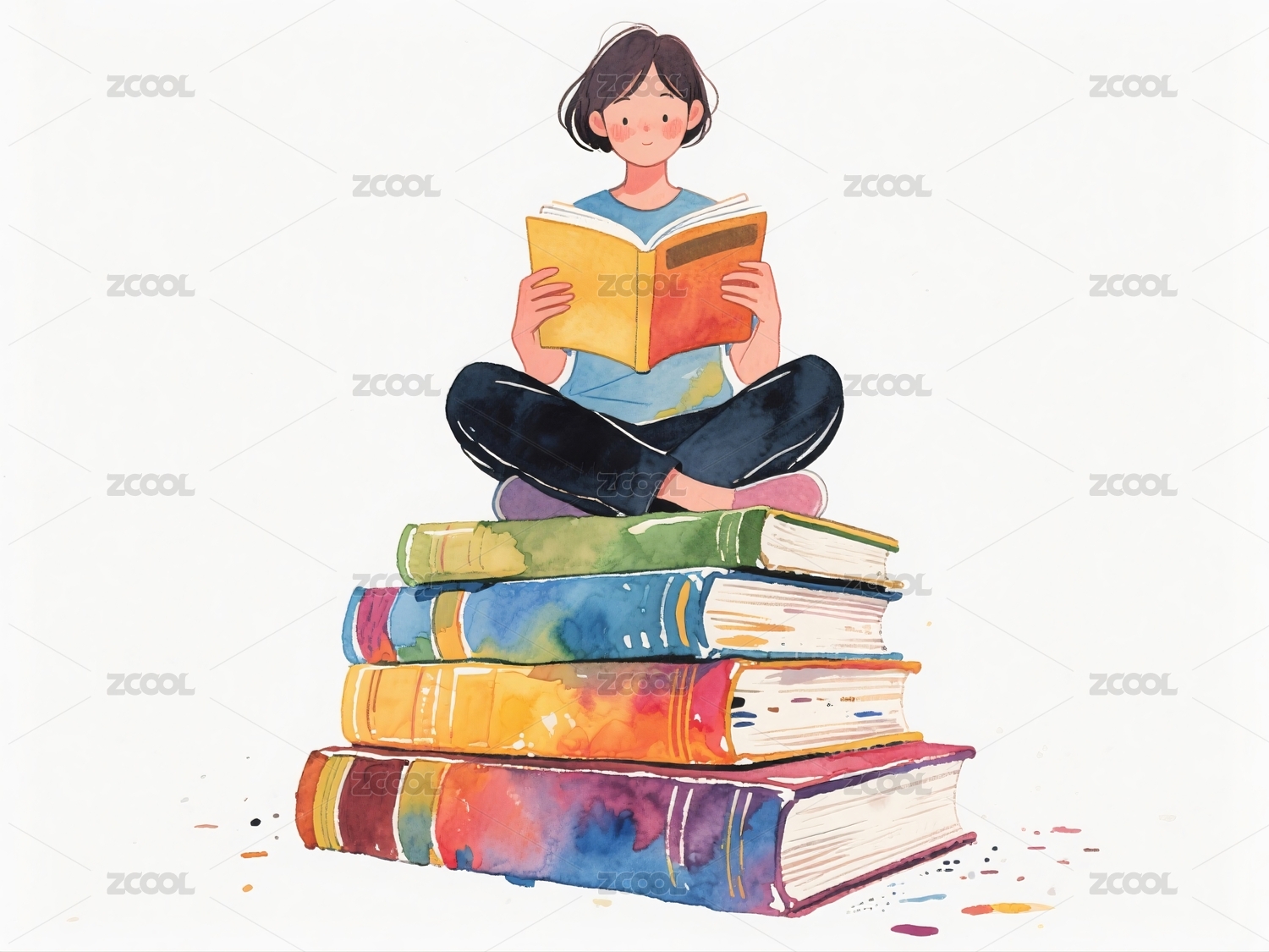 女孩阅读书籍坐于书堆之上