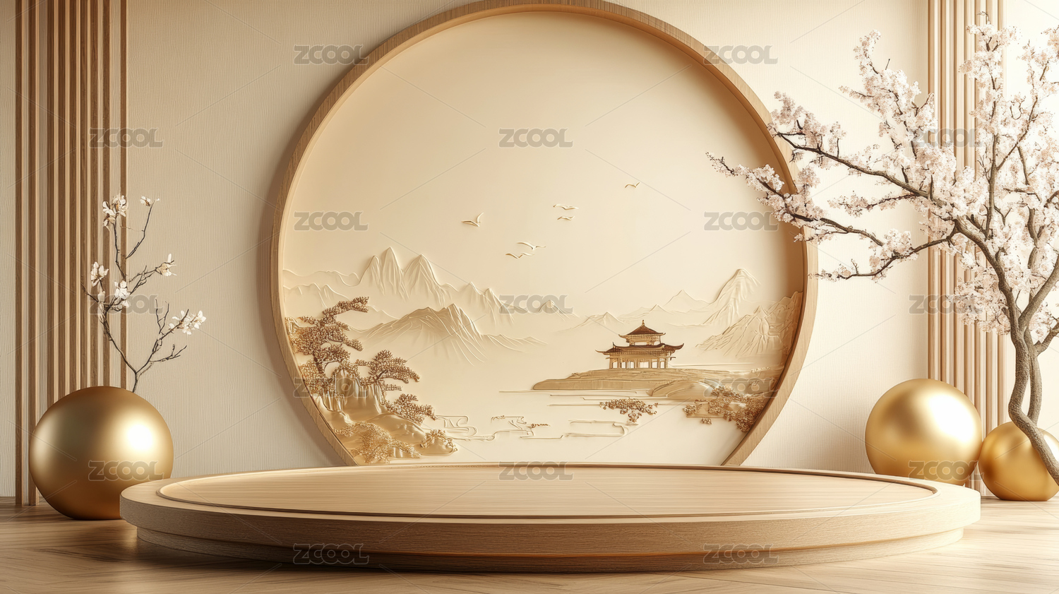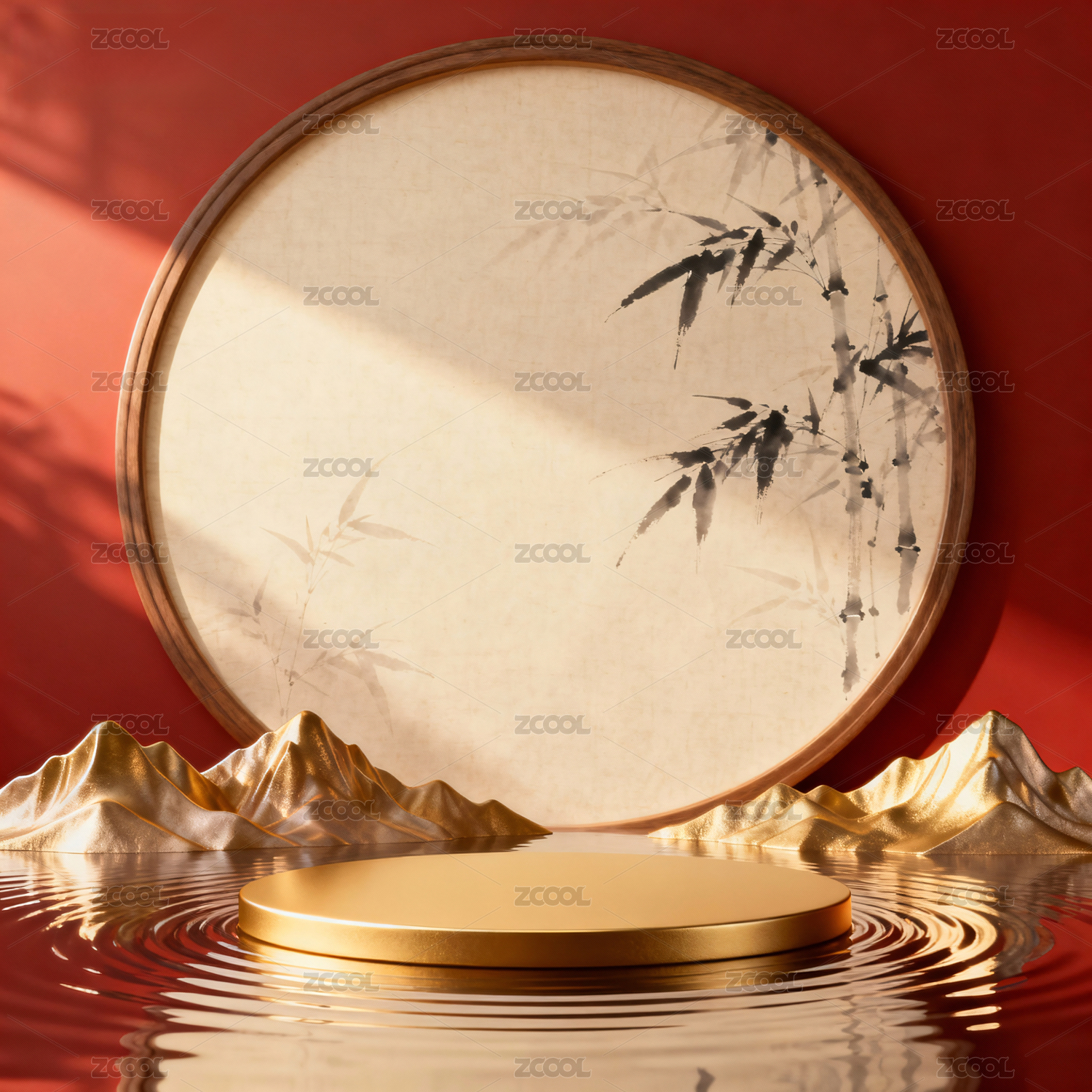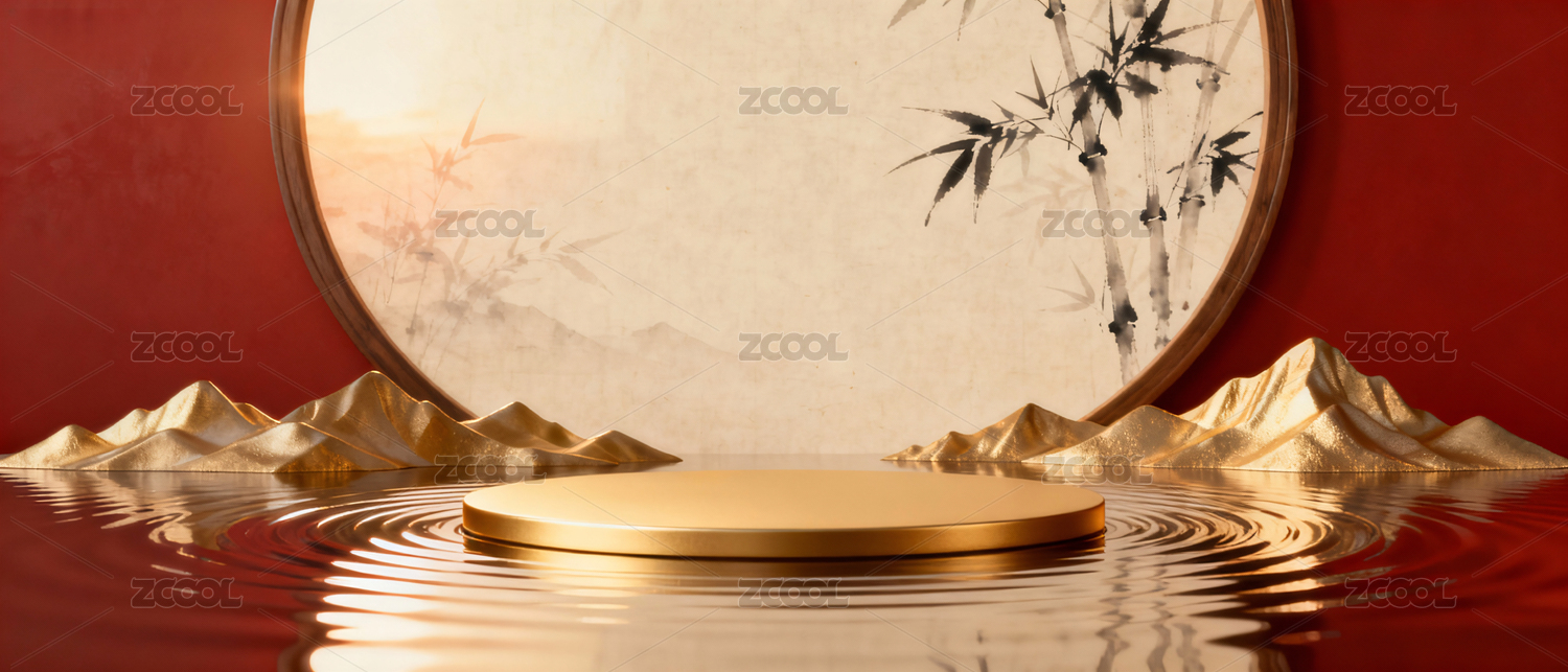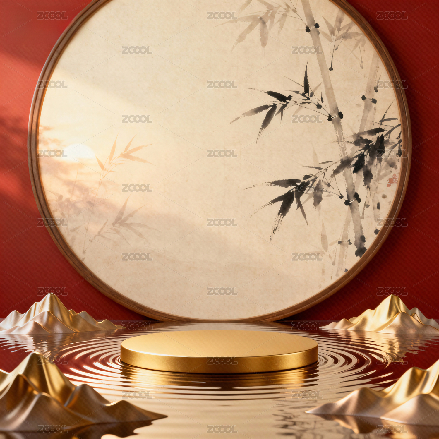 新中式,水墨,金色,展台,竹子,中国风,禅意,东方美学,山水,产品展台