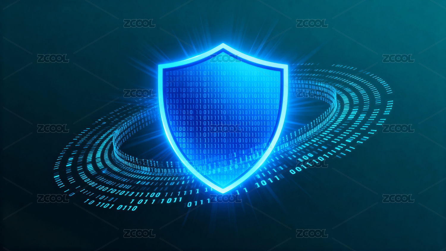 蓝色科技盾牌环绕二进制数据流