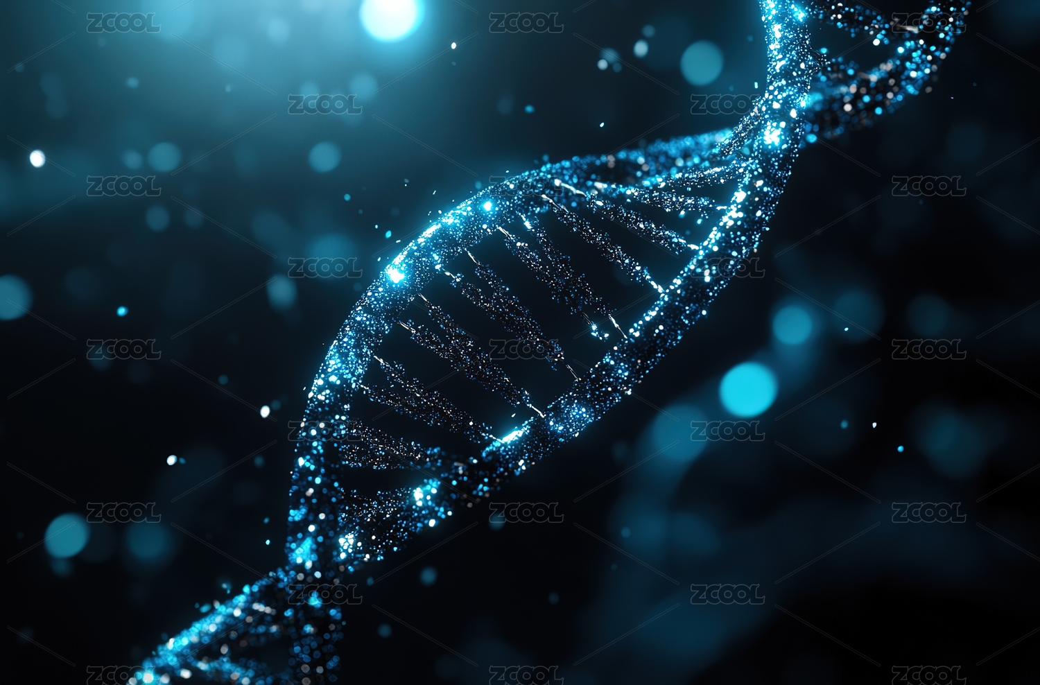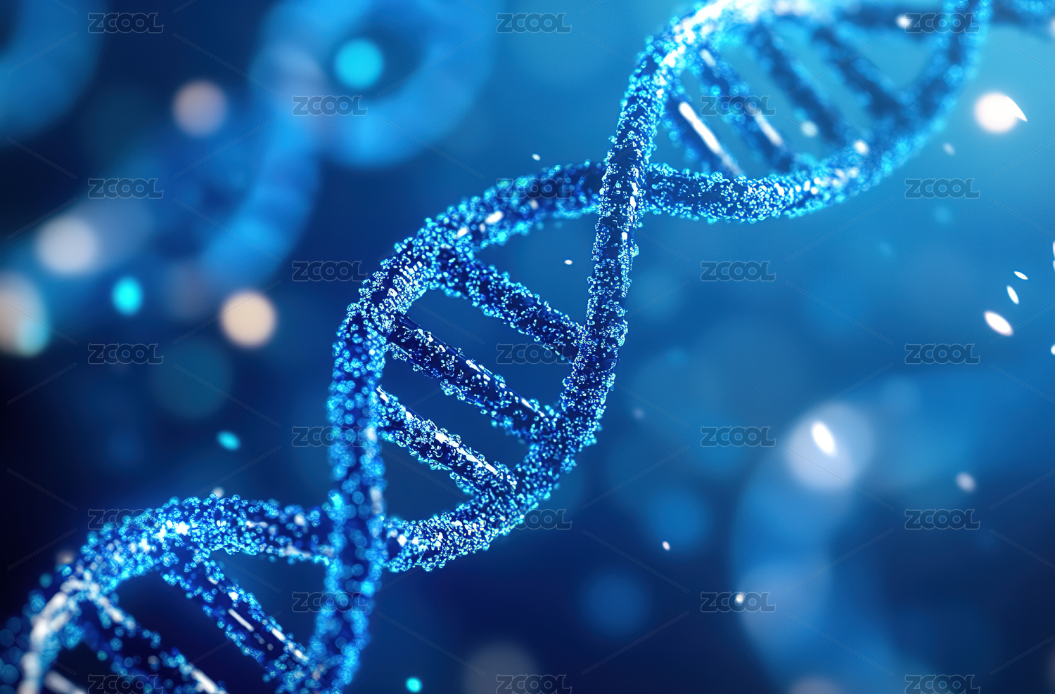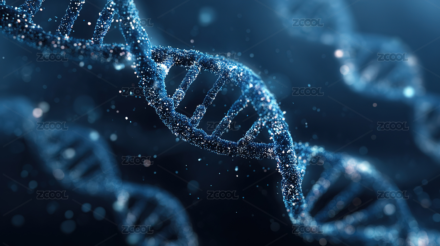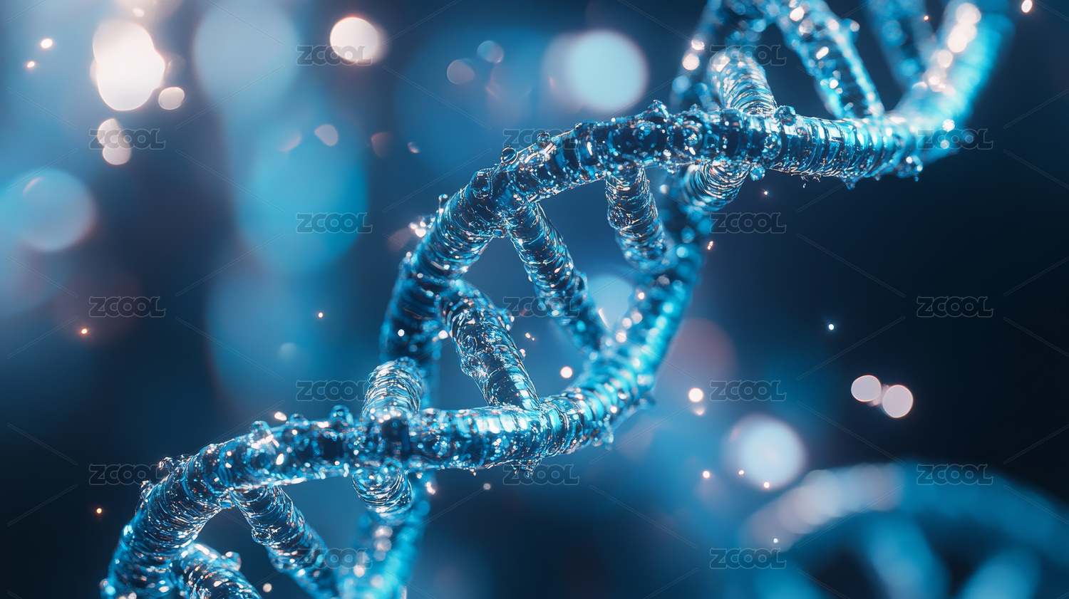 蓝色背景微观世界里的DNA 染色体螺旋结