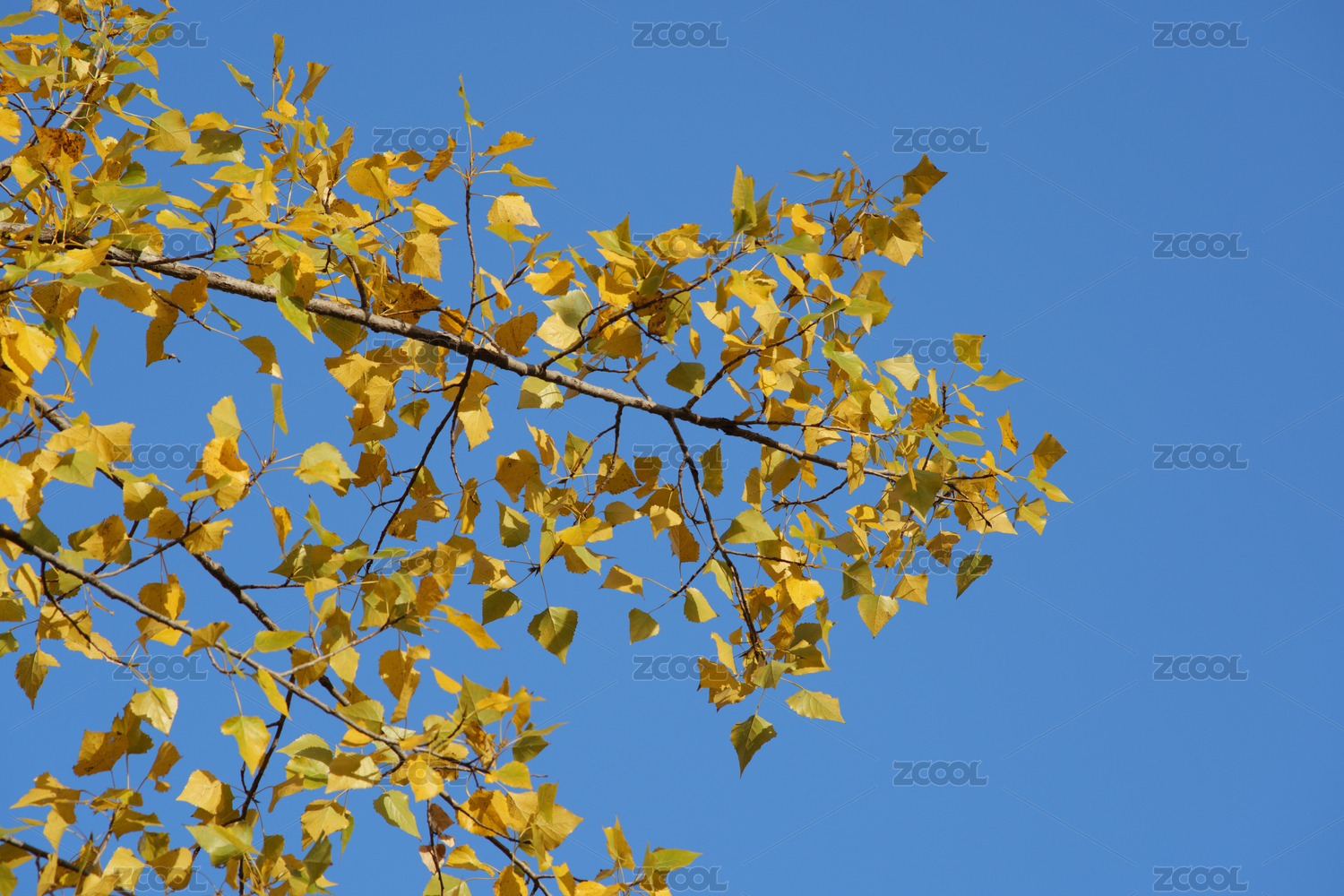 秋天晴朗蓝天映衬下金黄色的杨树叶子