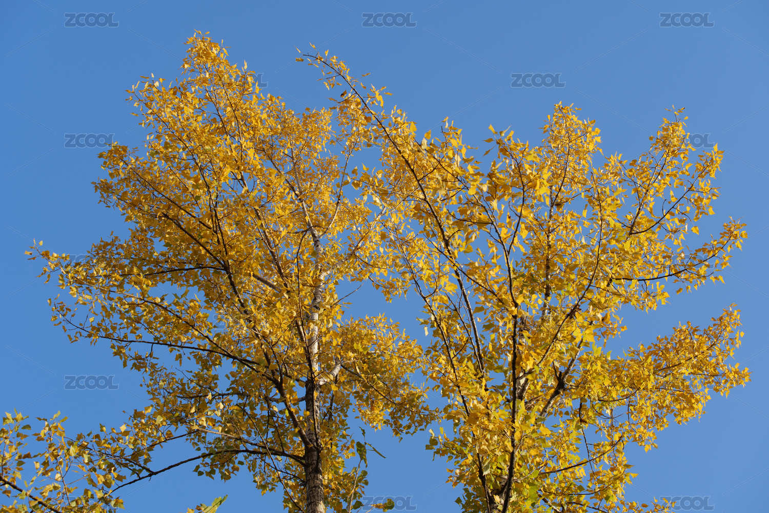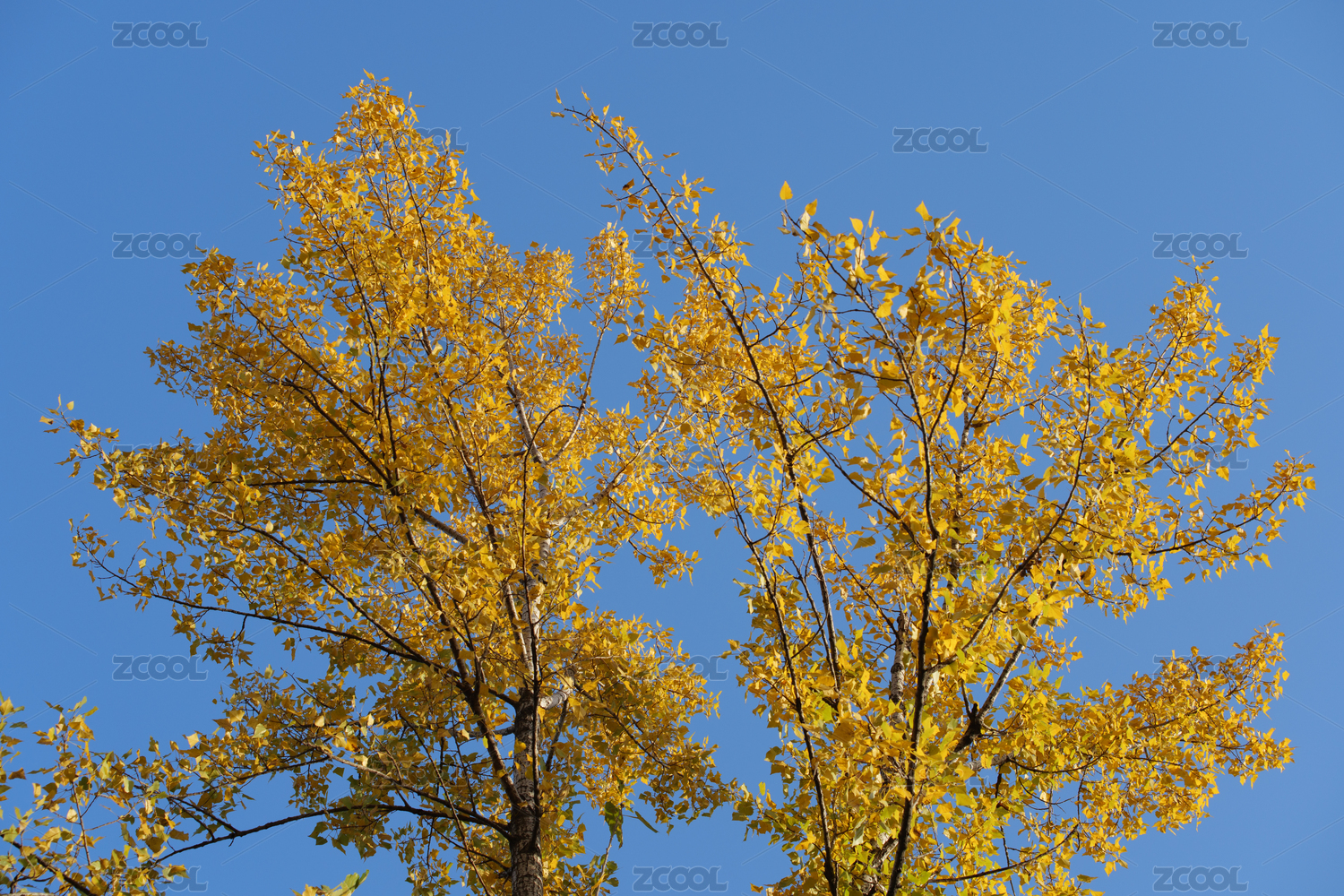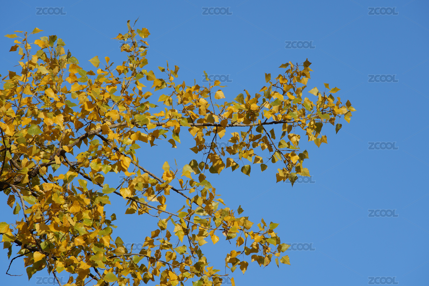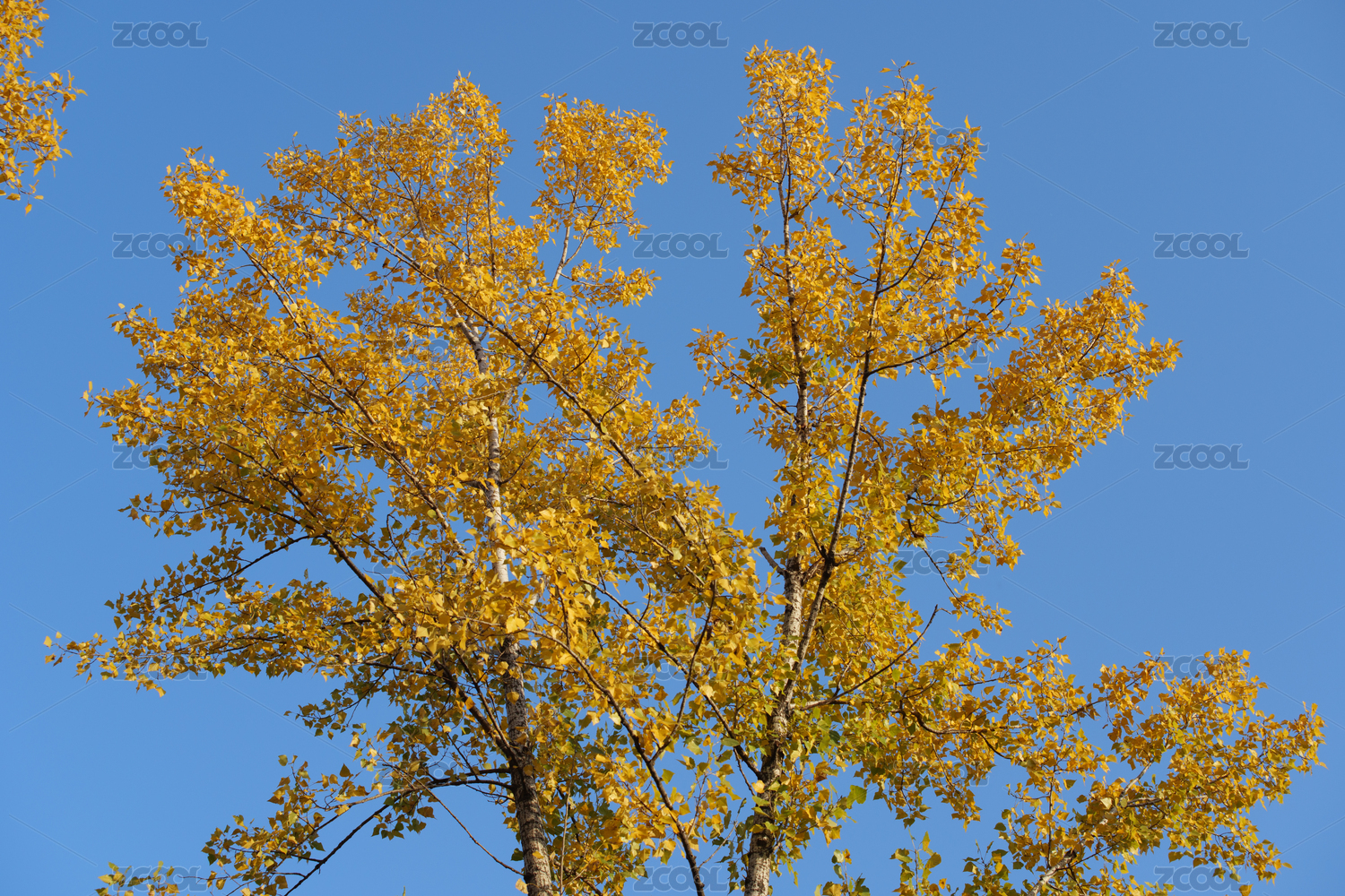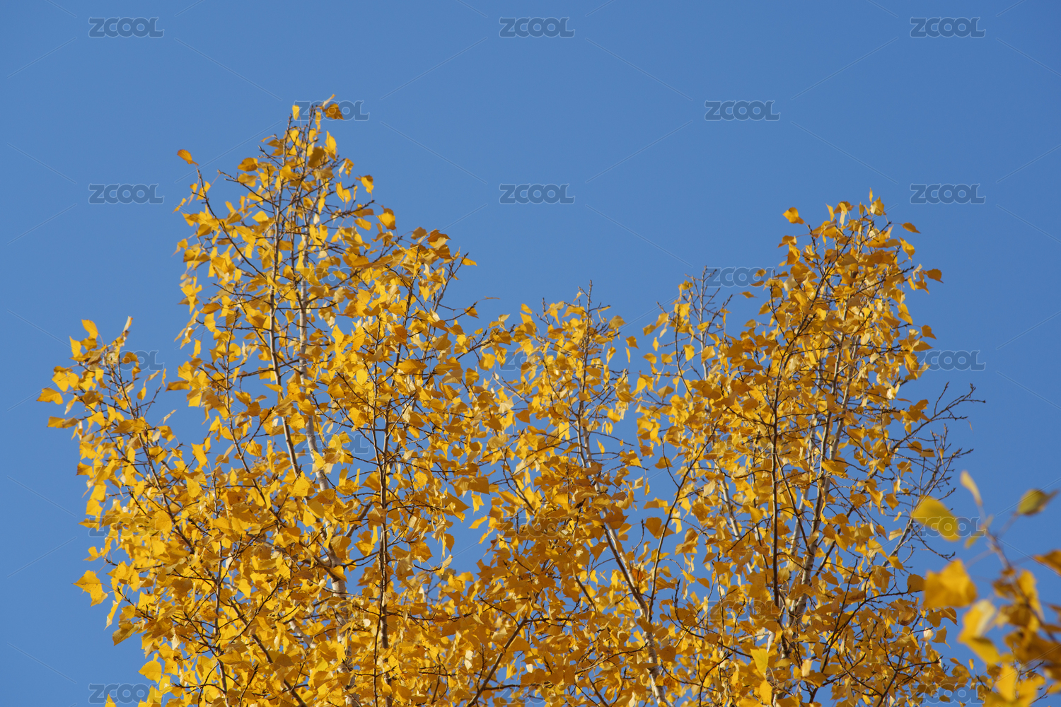 秋天晴朗蓝天映衬下金黄色的杨树叶子