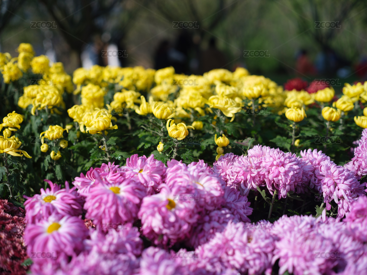 秋天的公园里颜色鲜艳的菊花在阳光下绽放
