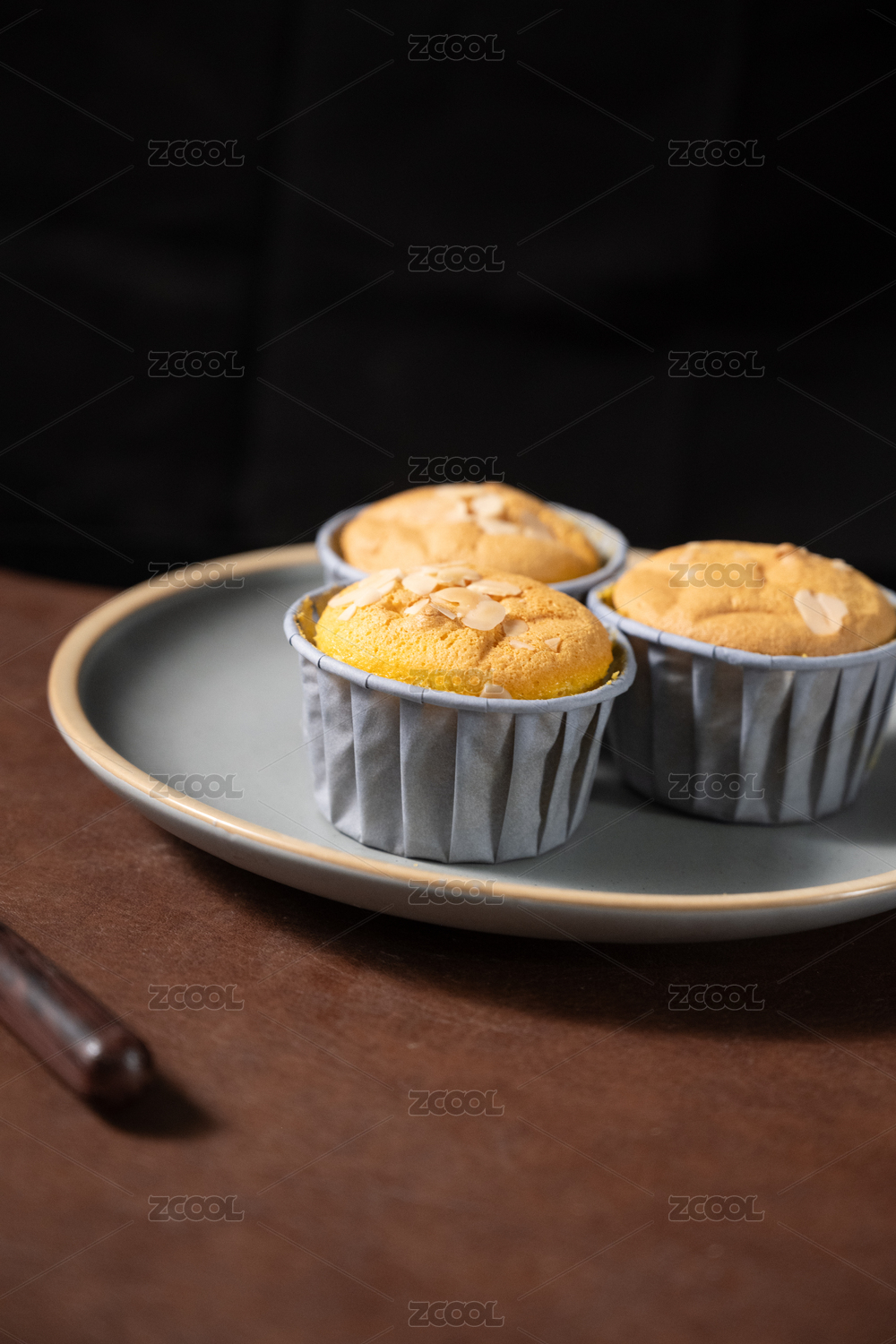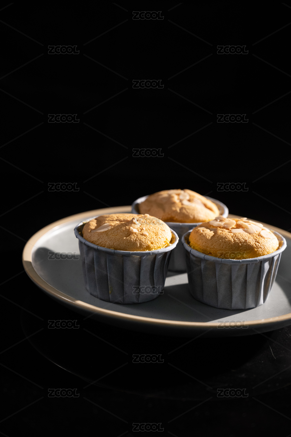 桌面上的盘子里的美味可口的纸杯蛋糕