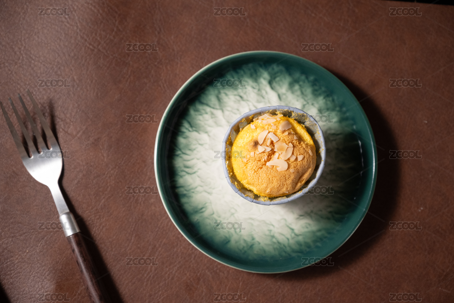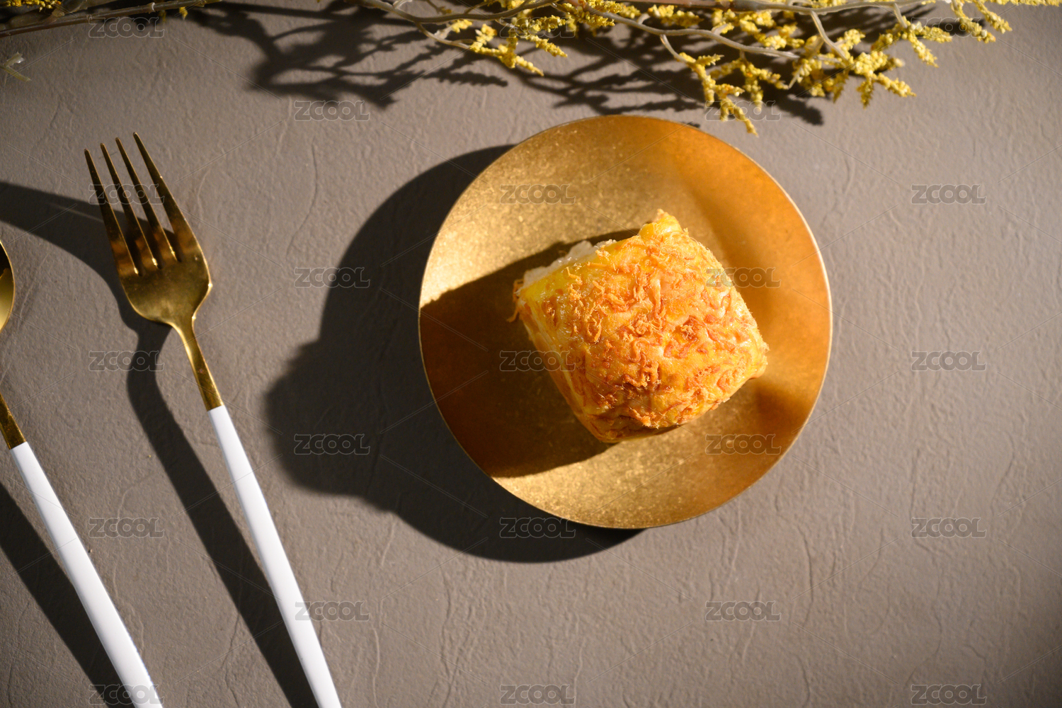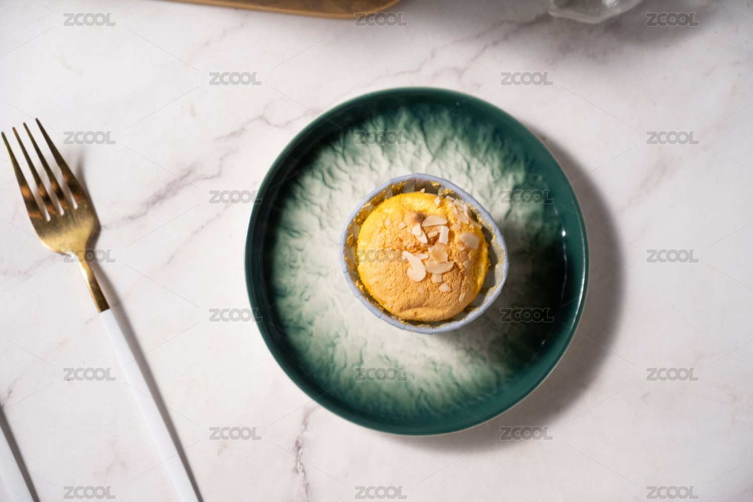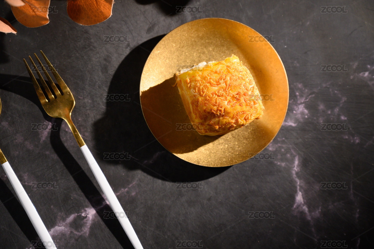 桌面上的盘子里的美味可口的芝士肉松蛋糕