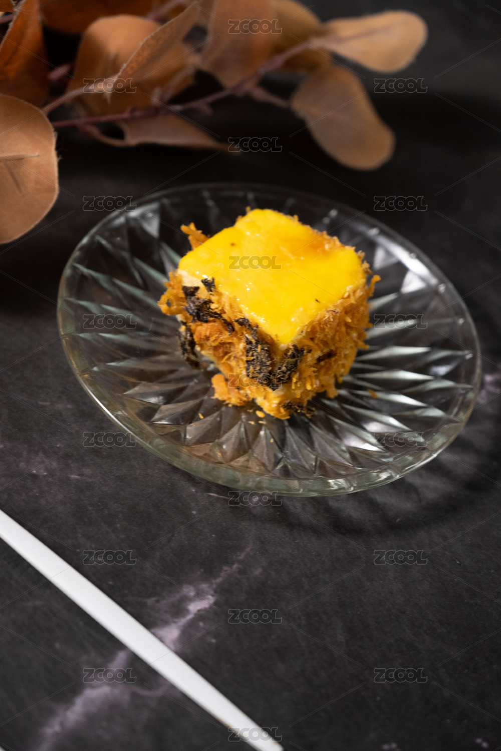 桌面上的盘子里的美味可口的芝士肉松蛋糕