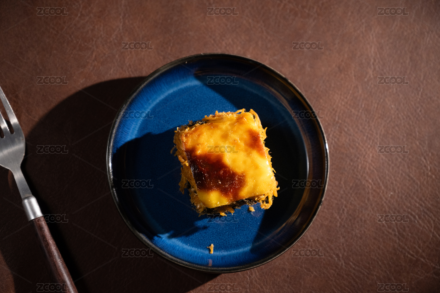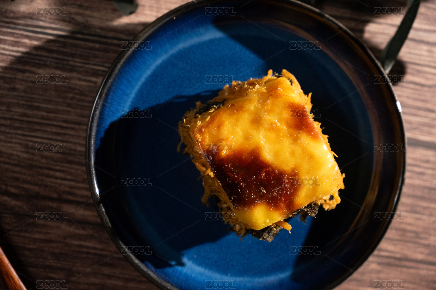 桌面上的盘子里的美味可口的芝士肉松蛋糕
