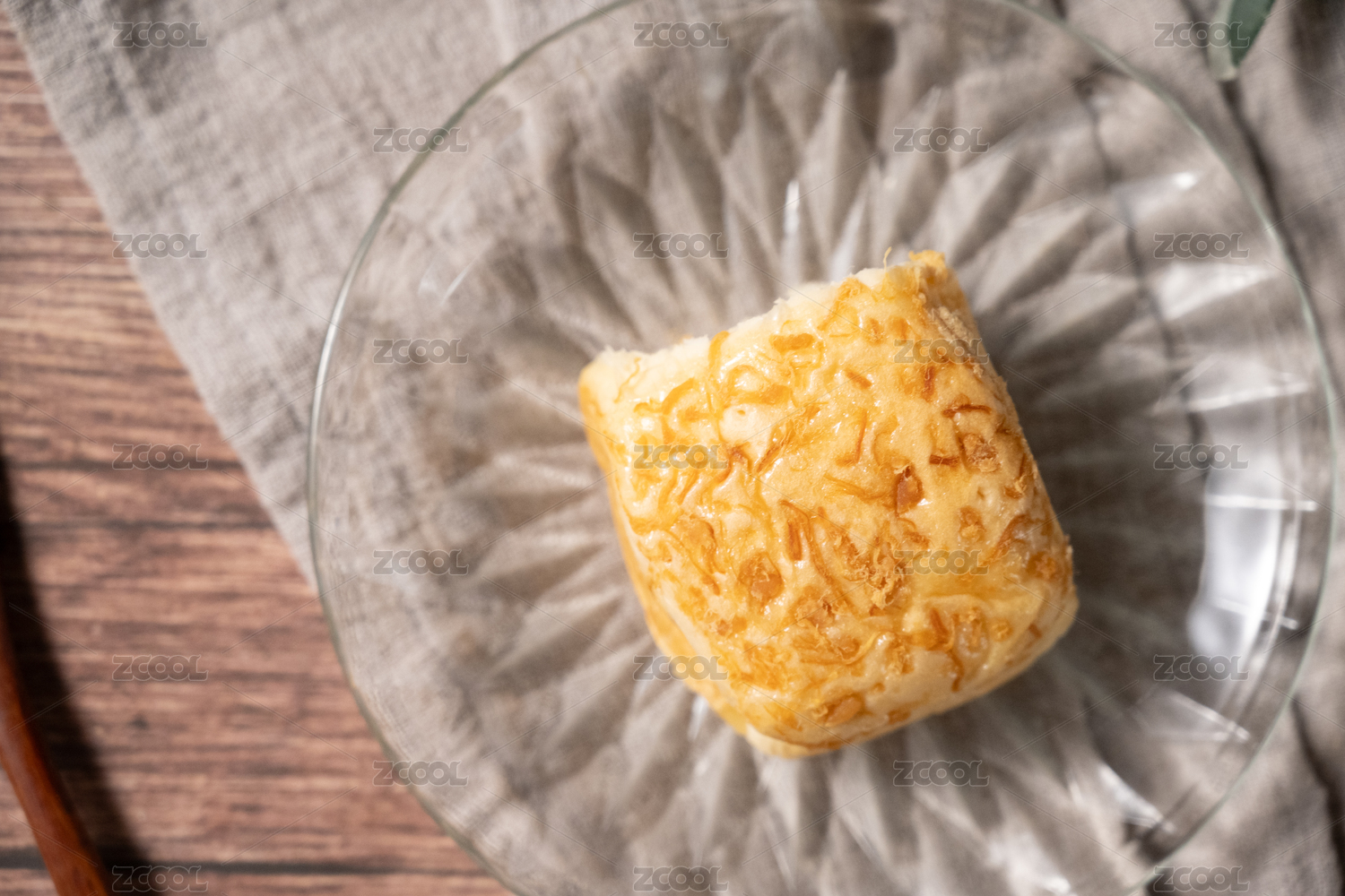 桌面上的盘子里的美味可口的芝士肉松蛋糕