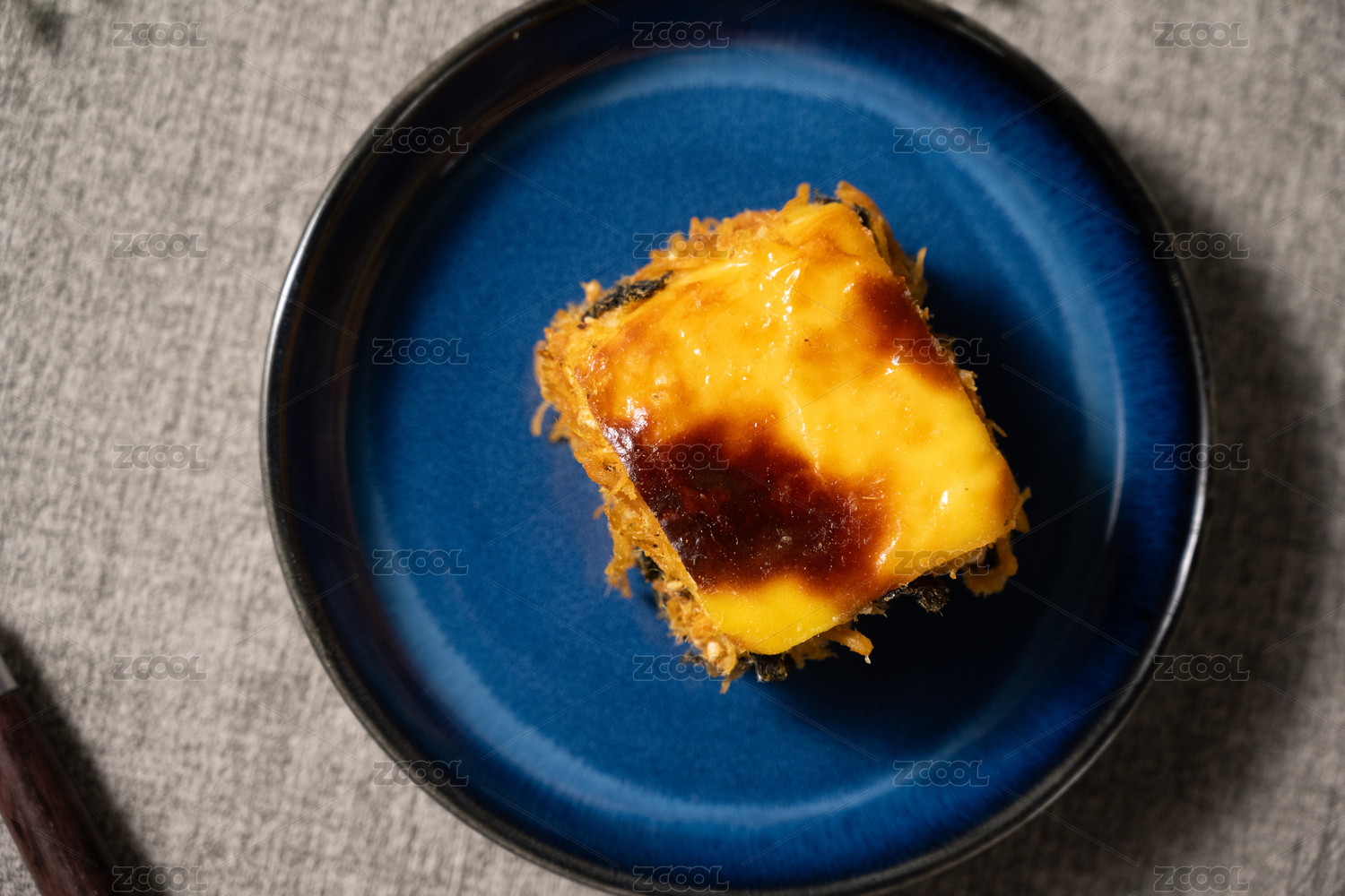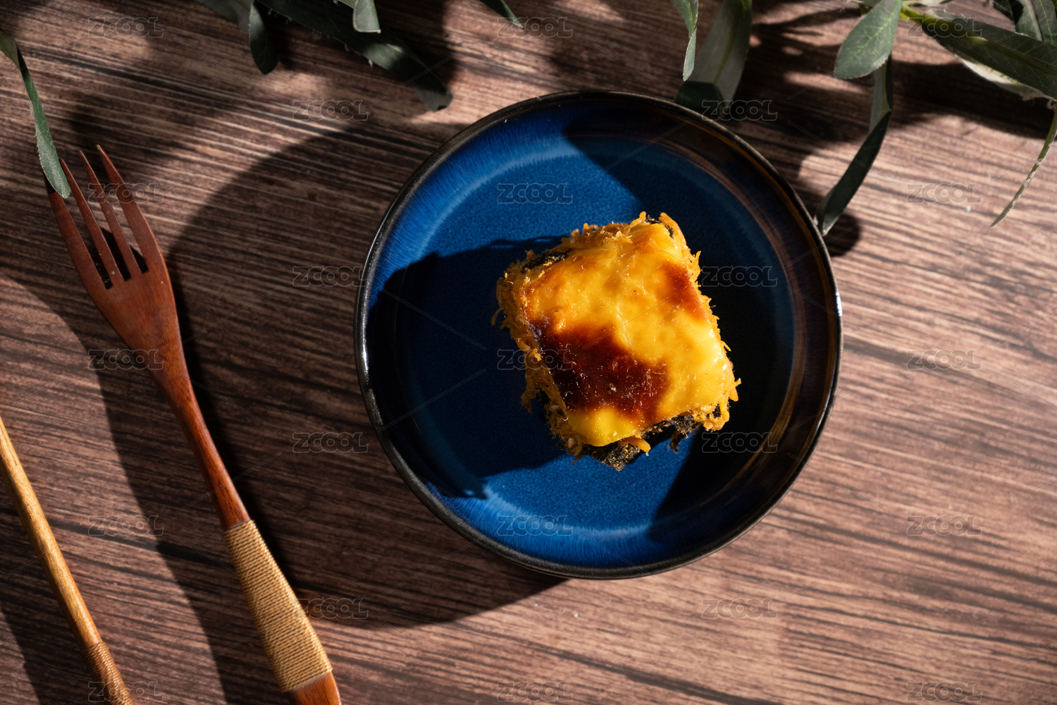桌面上的盘子里的美味可口的芝士肉松蛋糕