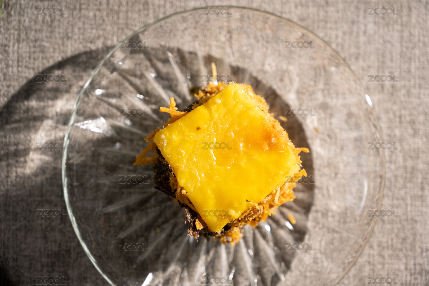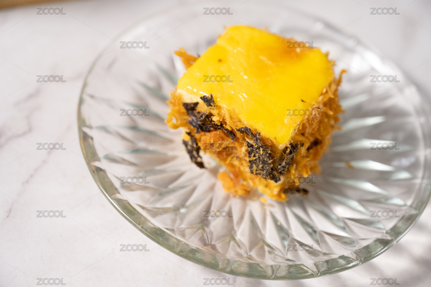 桌面上的盘子里的美味可口的芝士肉松蛋糕