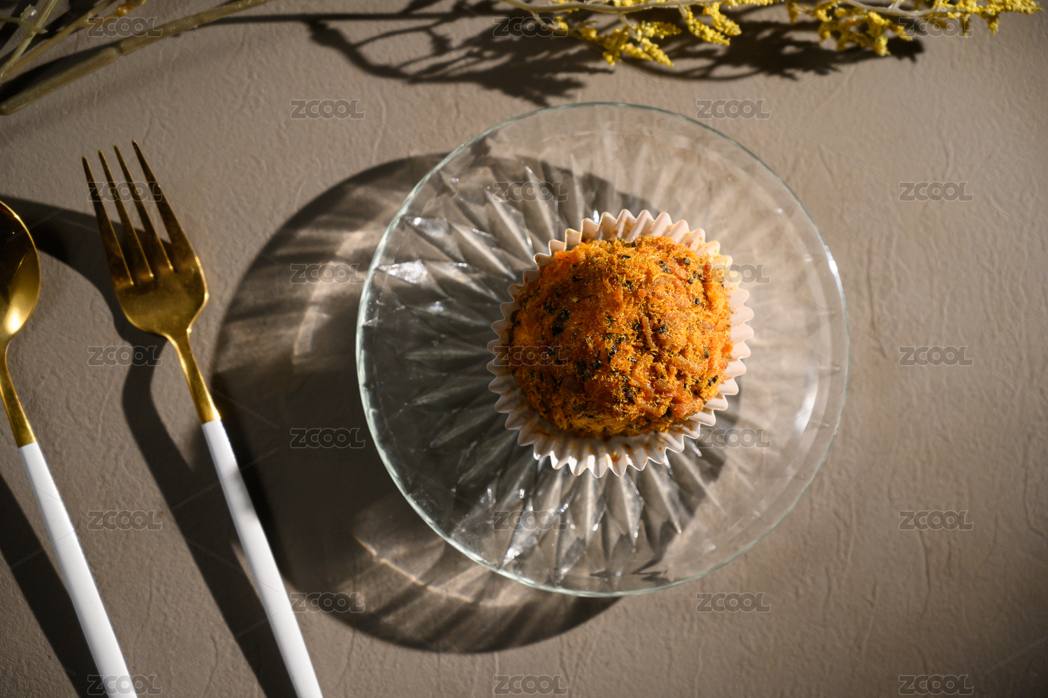 桌面上的盘子里的美味可口的芝士肉松蛋糕