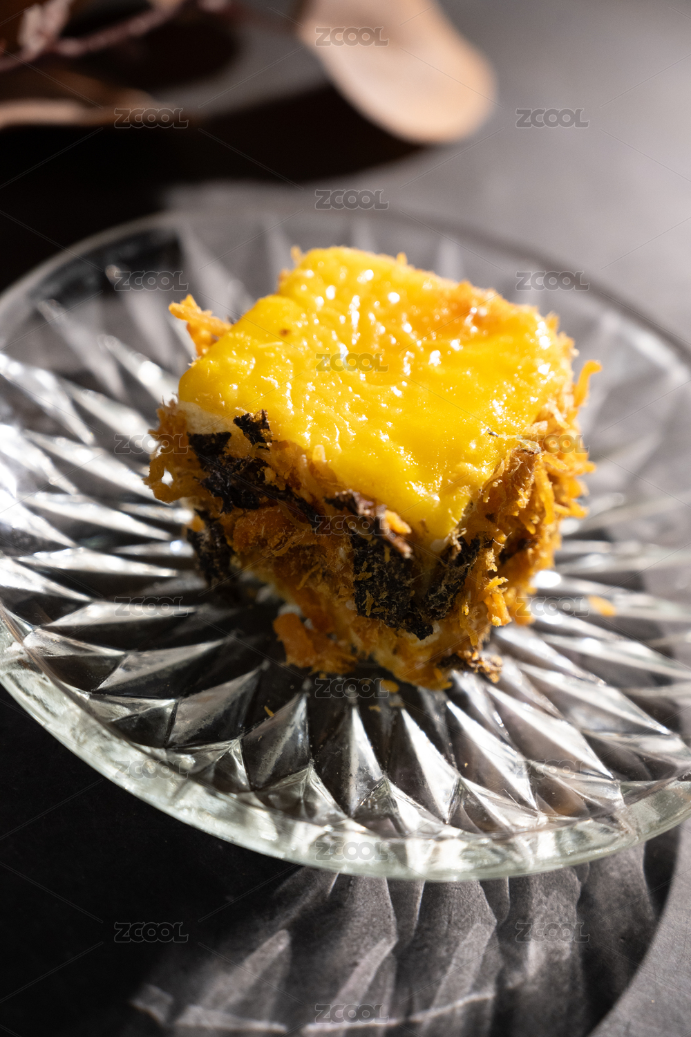 桌面上的盘子里的美味可口的芝士肉松蛋糕